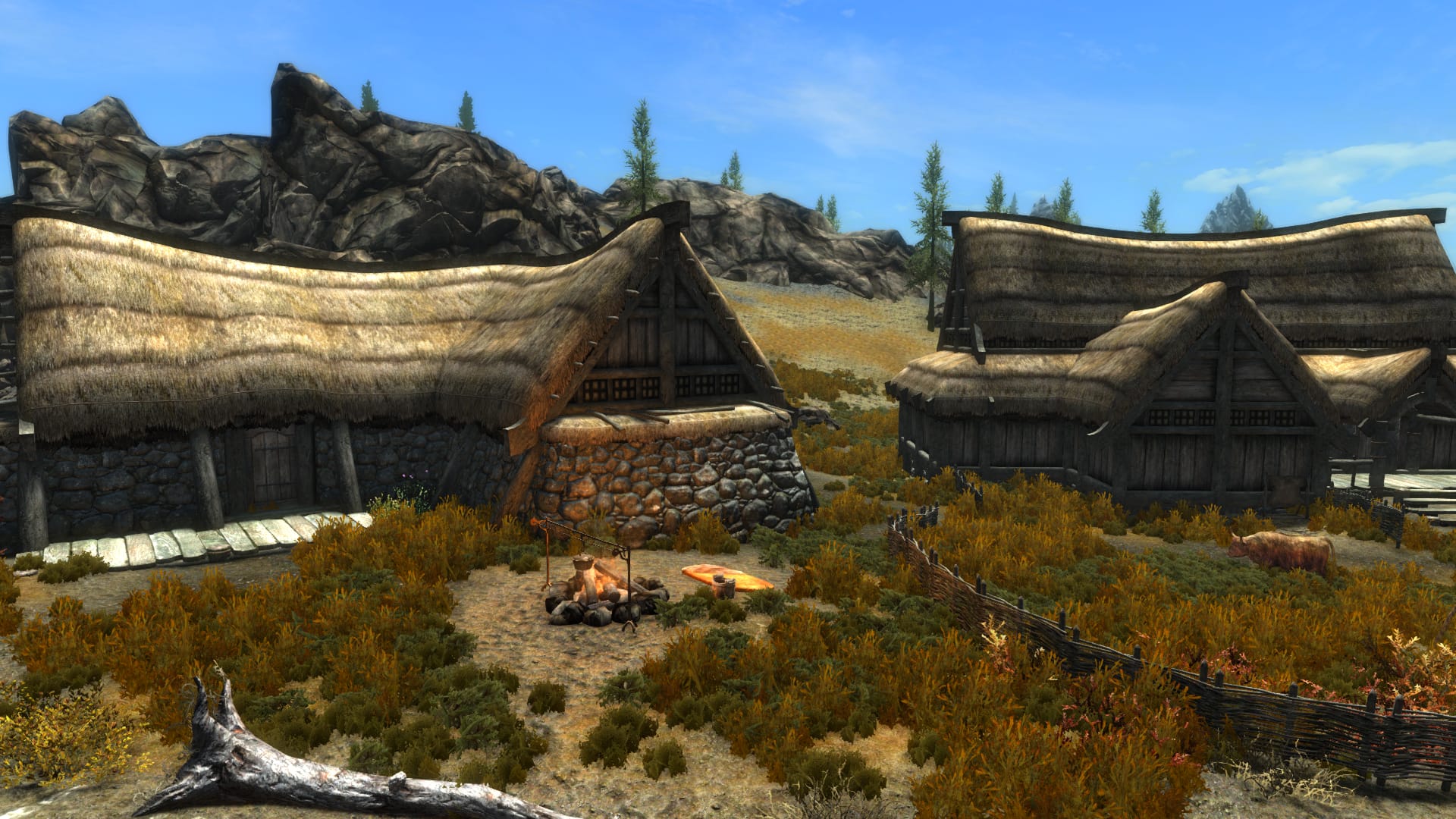 Riverwood is one of the first towns a player will land when starting the game. It was important to reflect the inherent nature of this little lumber town in ways that made sense. The lumber yard was expanded with actual lumber jacks, along with beautiful trappings of the nature around the town.
