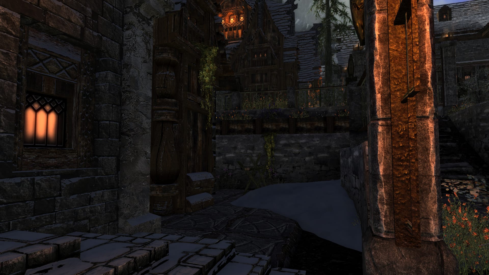 Riften is located in the largest world space so the goal was to keep it simple yet also engaging. The center market was revamped, new NPCs that wander in less busy areas to make the city seem more alive without causing strain.