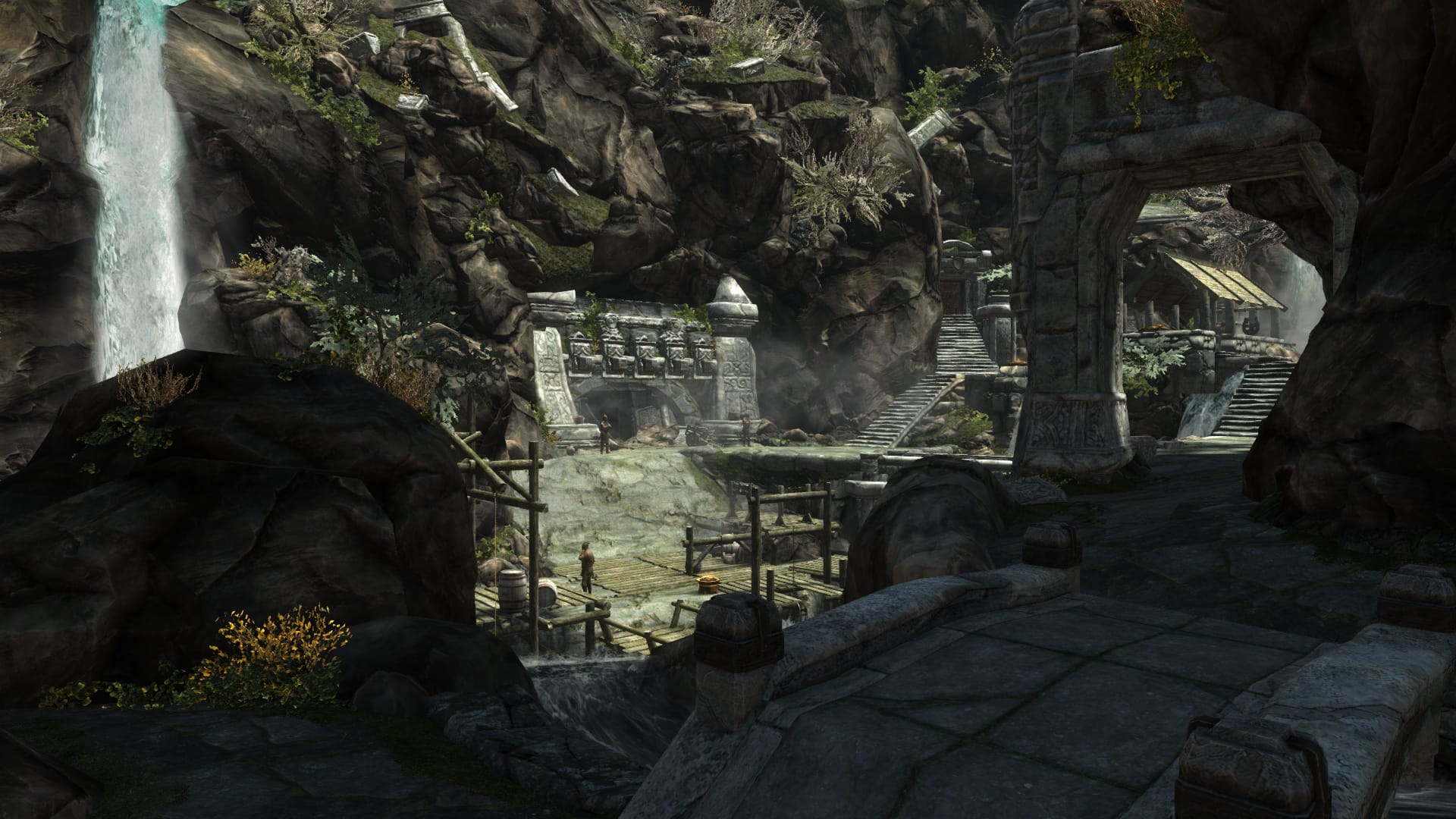 Riften is located in the largest world space so the goal was to keep it simple yet also engaging. The center market was revamped, new NPCs that wander in less busy areas to make the city seem more alive without causing strain.