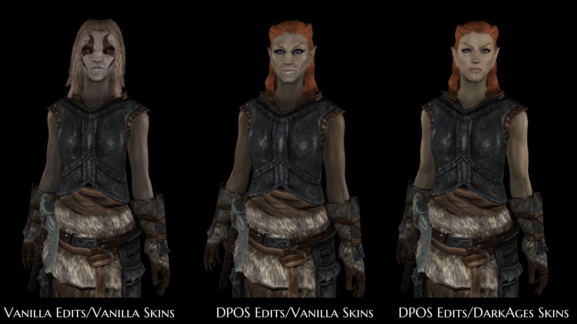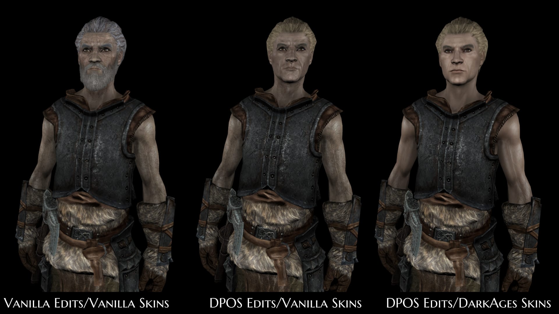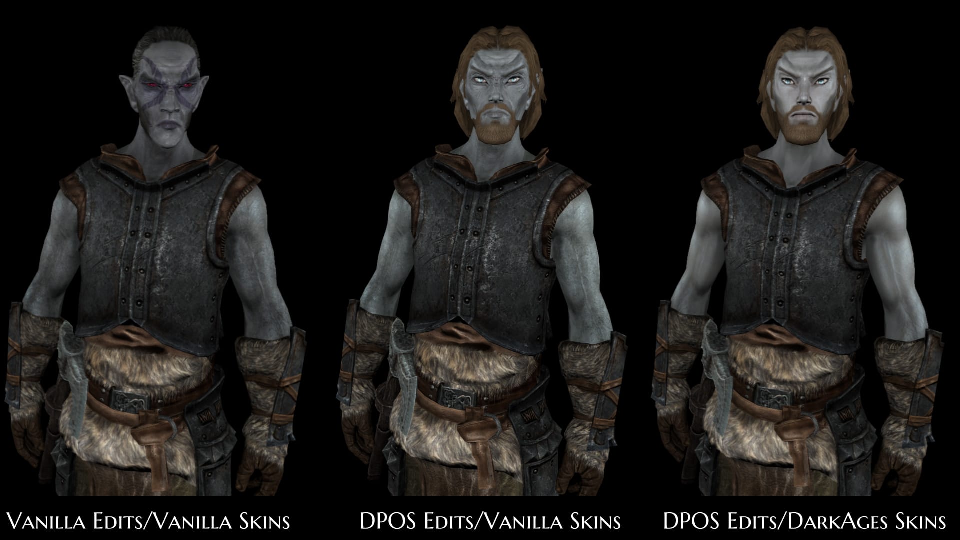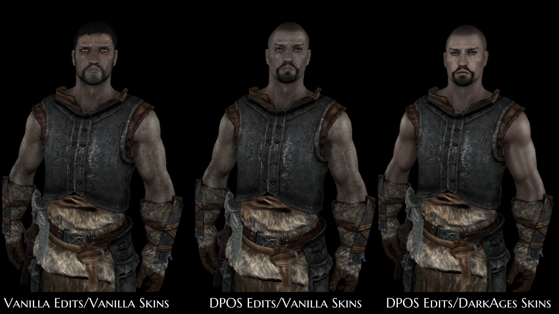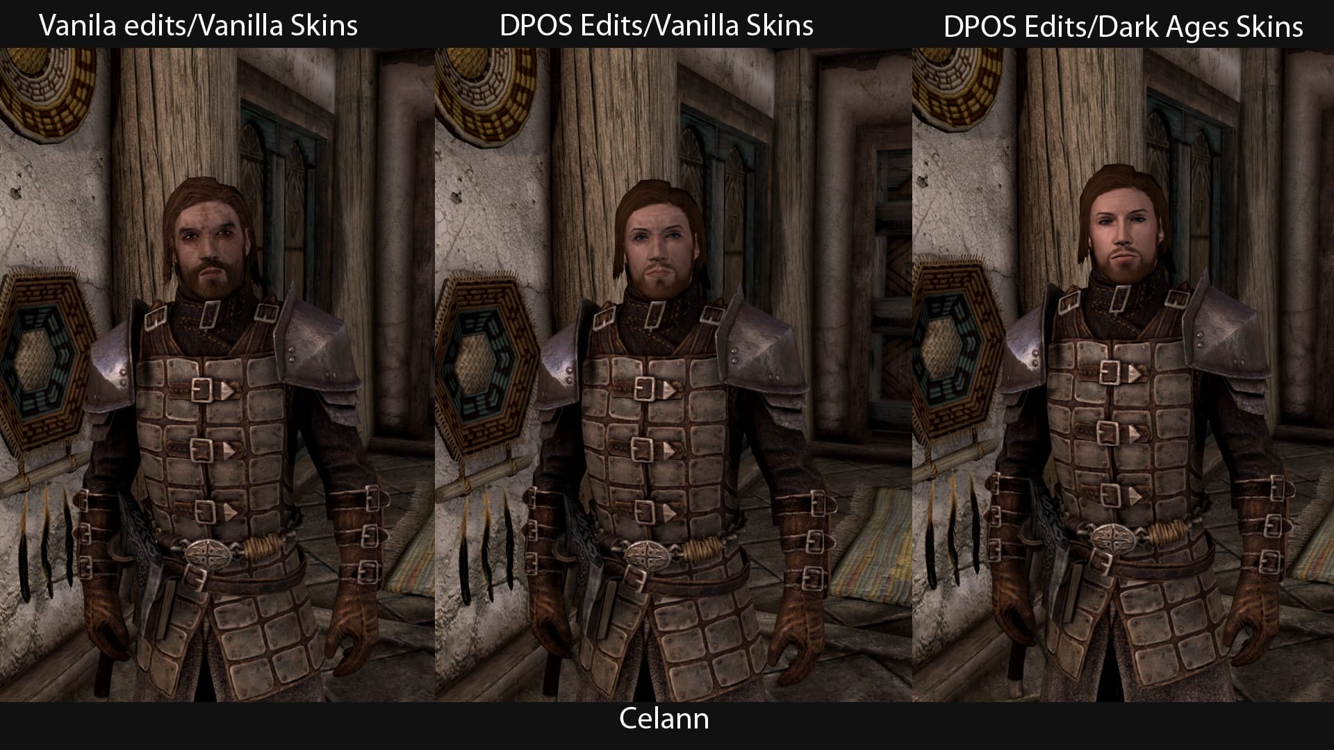 In the galleries below there are showcases of what DPOS does with or without skins. The vanilla skins are very opaque and so dirty it’s hard to get a grasp on your actual options. Dark Ages Skins was chosen to display the range of options due to the fact it offers zero pixelation and faux smudges so you can get a visual idea of how your character can look. As always: DPOS contains no skin textures itself.