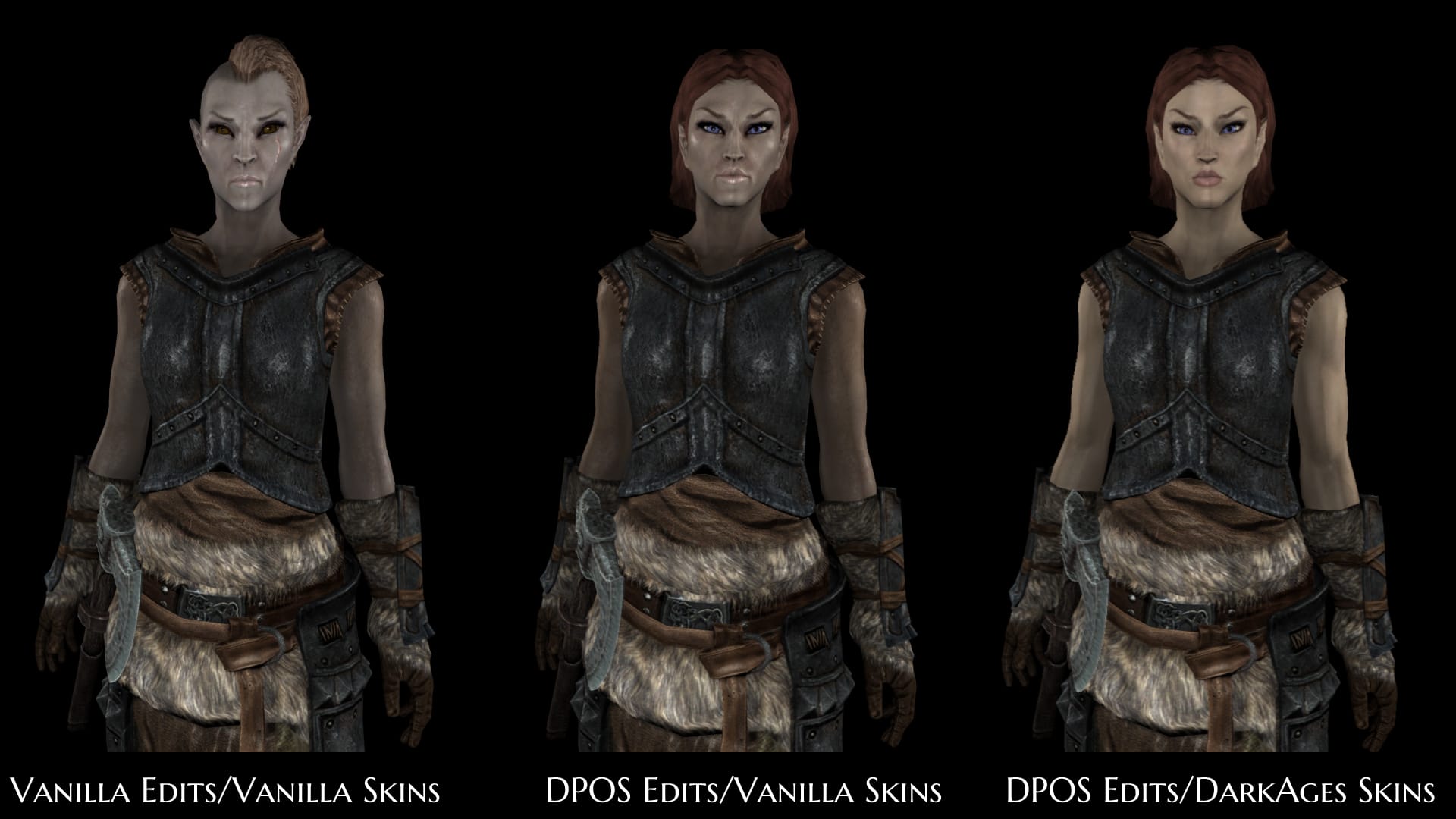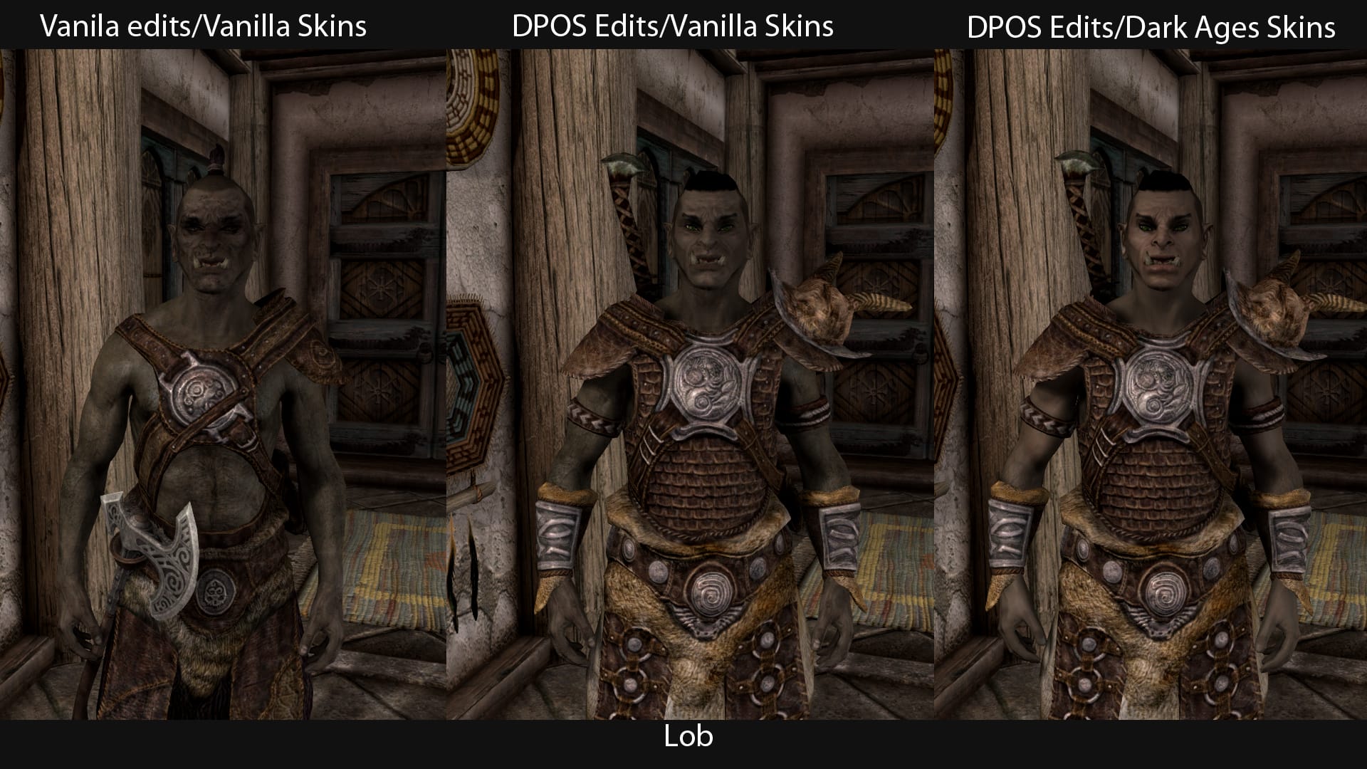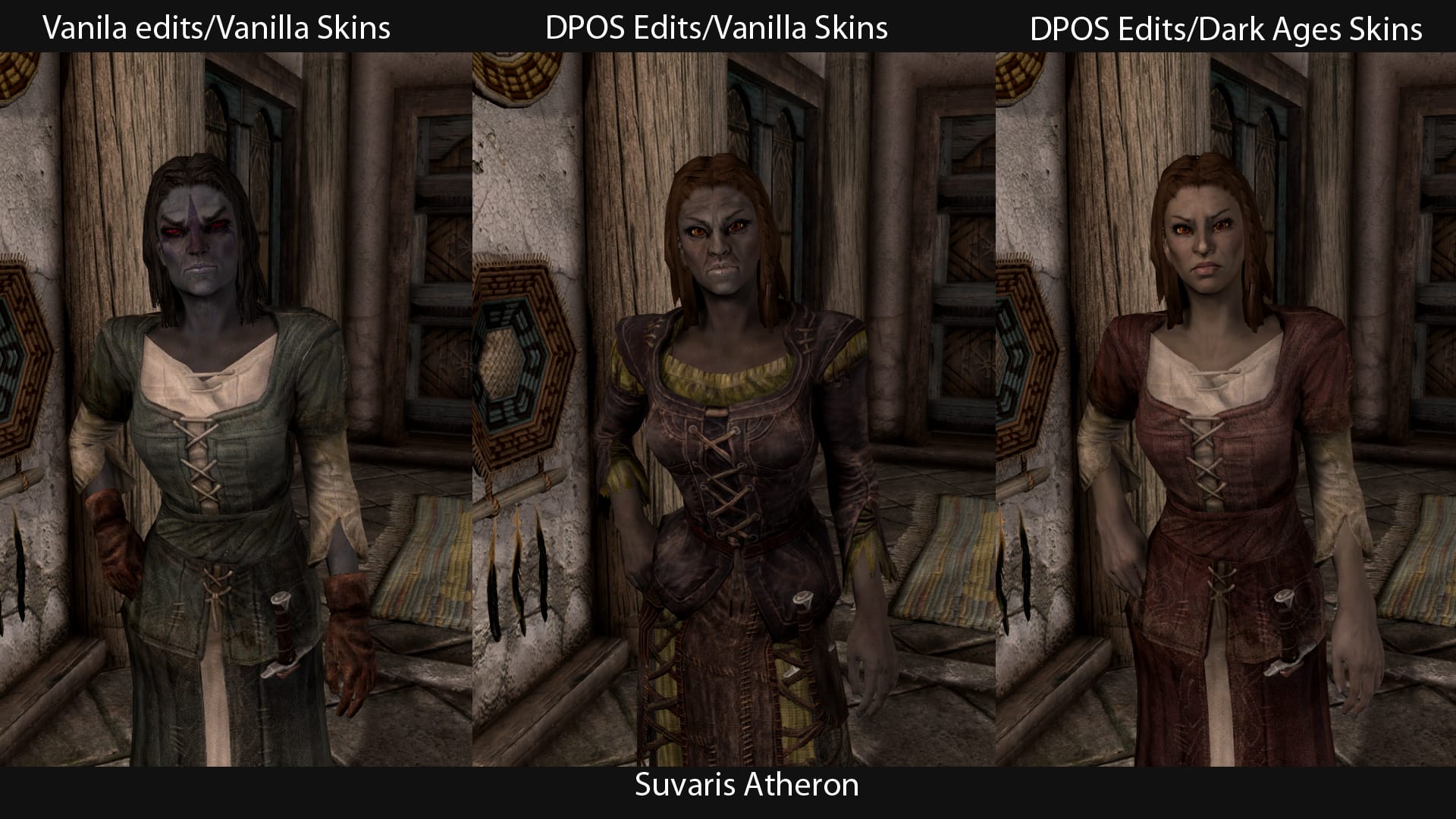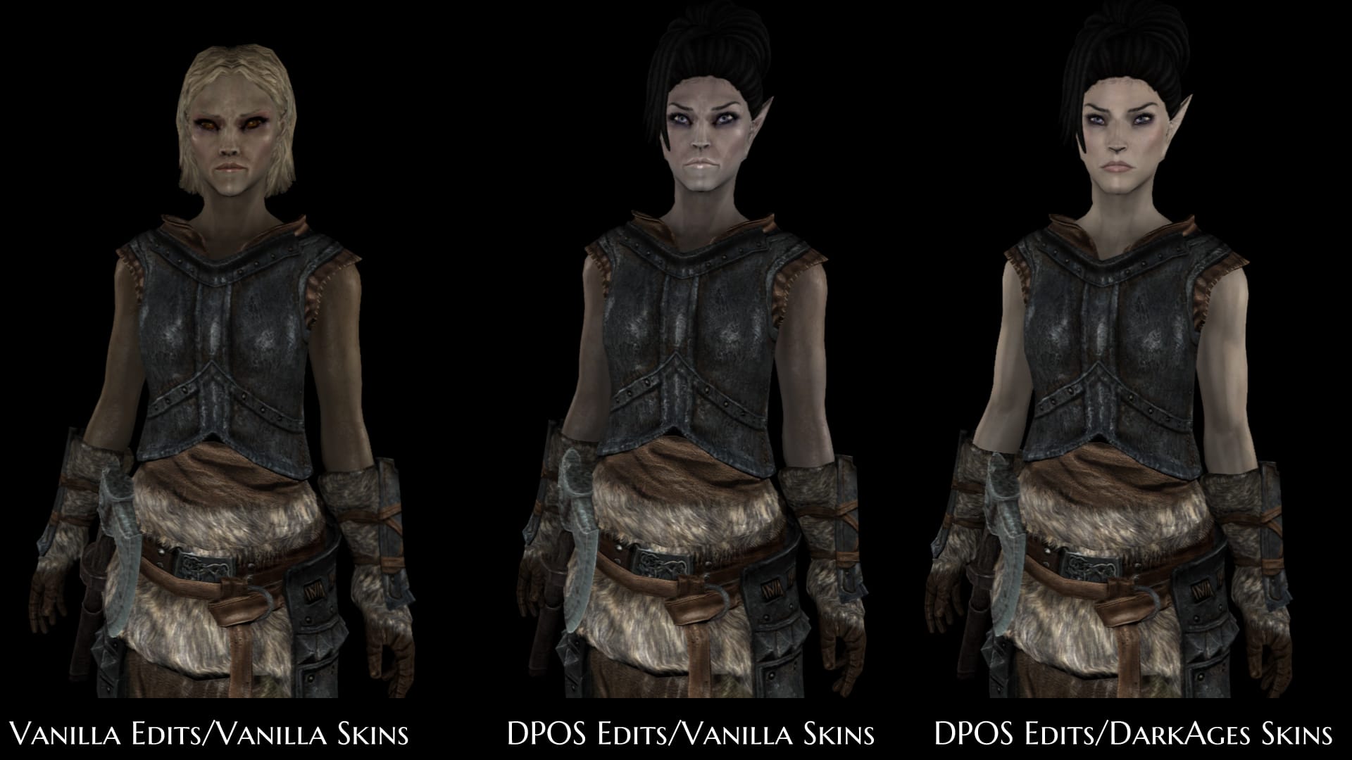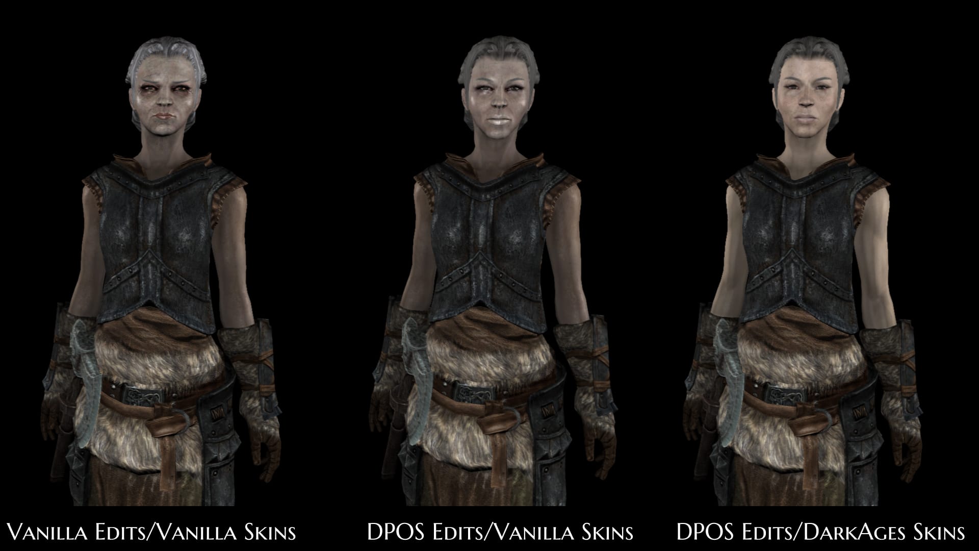 In the galleries below there are showcases of what DPOS does with or without skins. The vanilla skins are very opaque and so dirty it’s hard to get a grasp on your actual options. Dark Ages Skins was chosen to display the range of options due to the fact it offers zero pixelation and faux smudges so you can get a visual idea of how your character can look. As always: DPOS contains no skin textures itself.