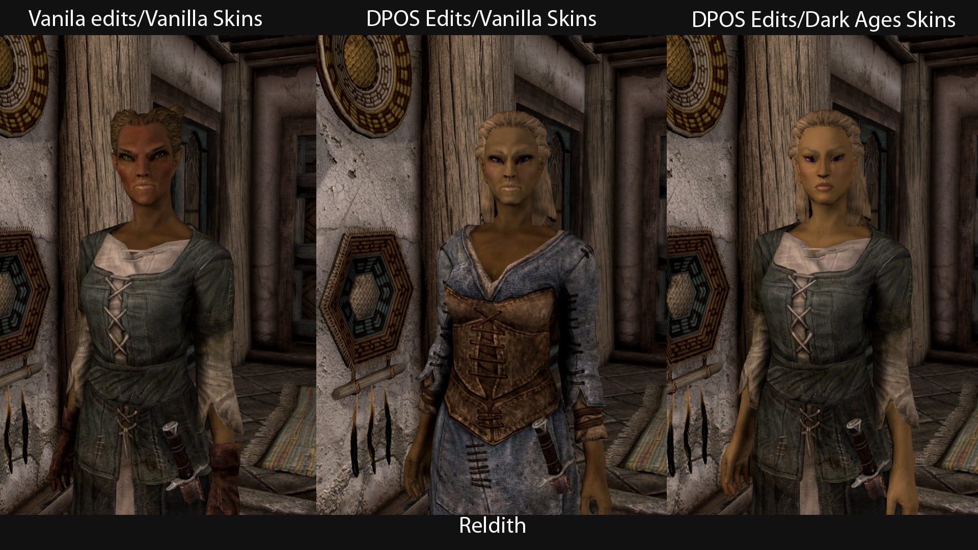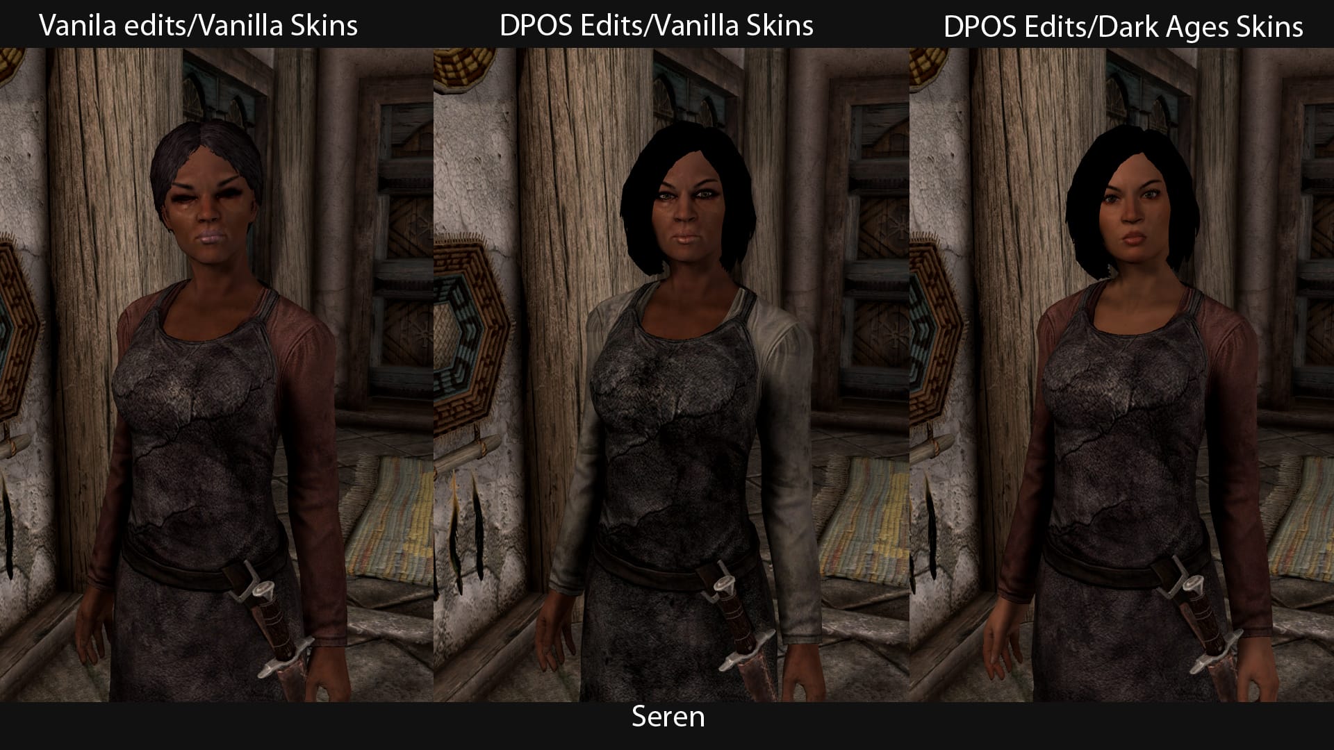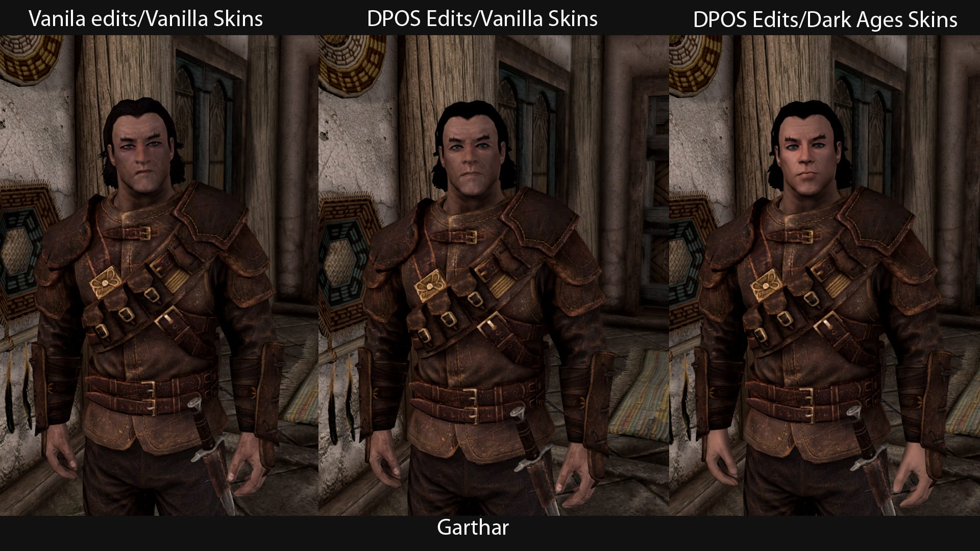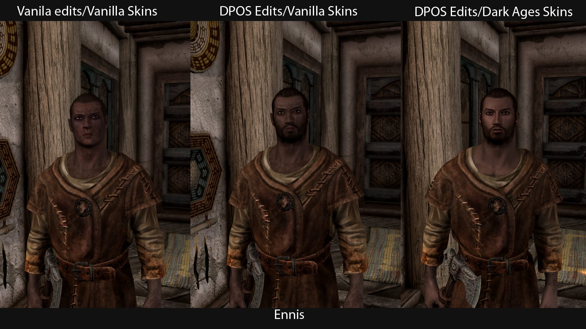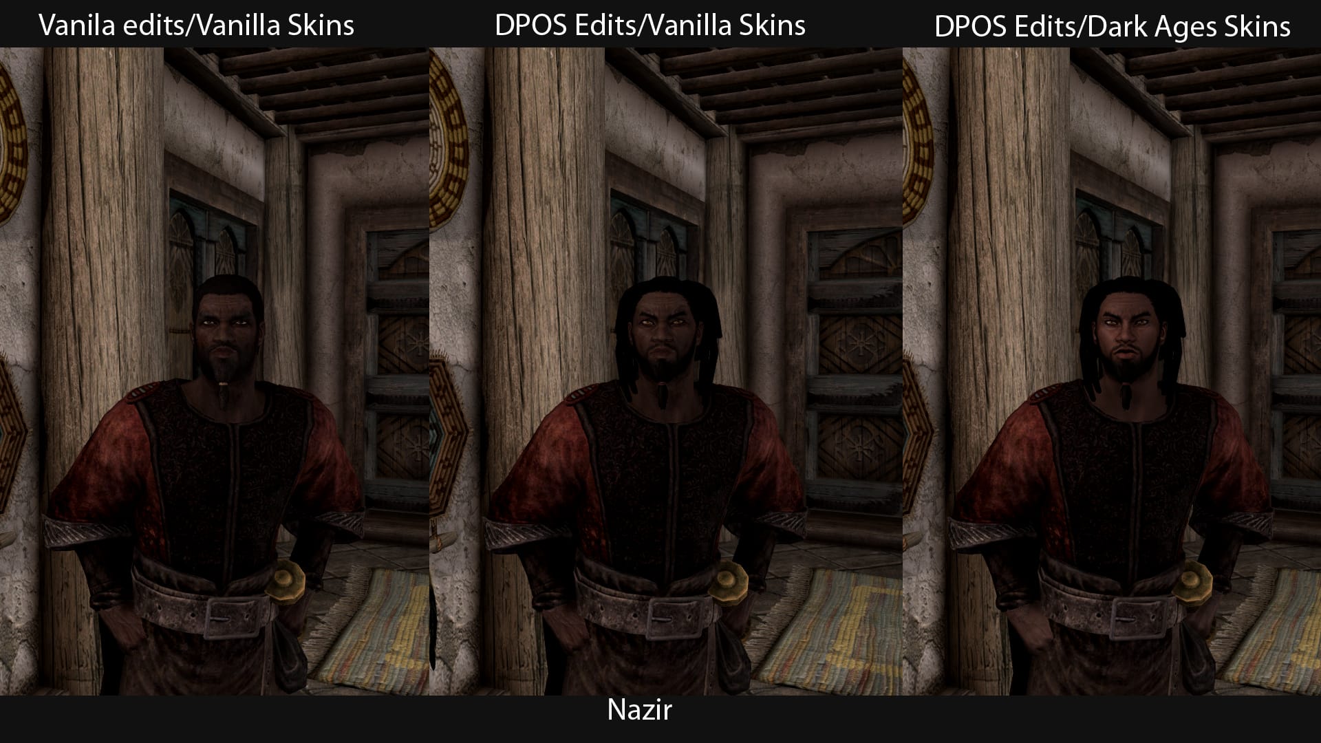 In the galleries below there are showcases of what DPOS does with or without skins. The vanilla skins are very opaque and so dirty it’s hard to get a grasp on your actual options. Dark Ages Skins was chosen to display the range of options due to the fact it offers zero pixelation and faux smudges so you can get a visual idea of how your character can look. As always: DPOS contains no skin textures itself.