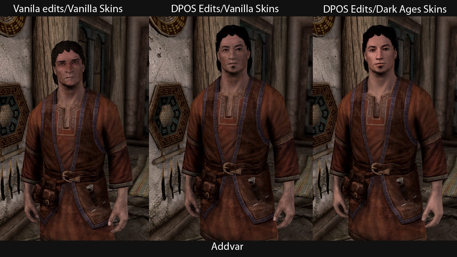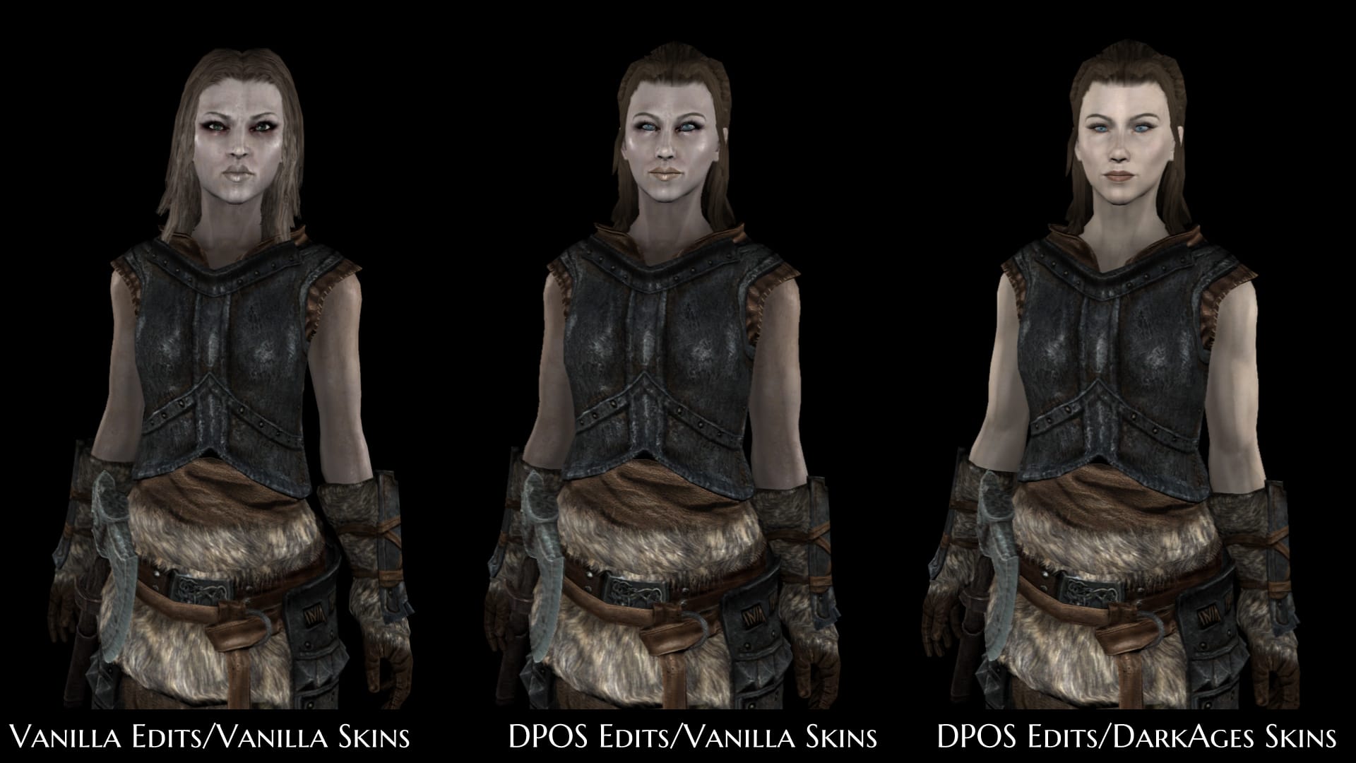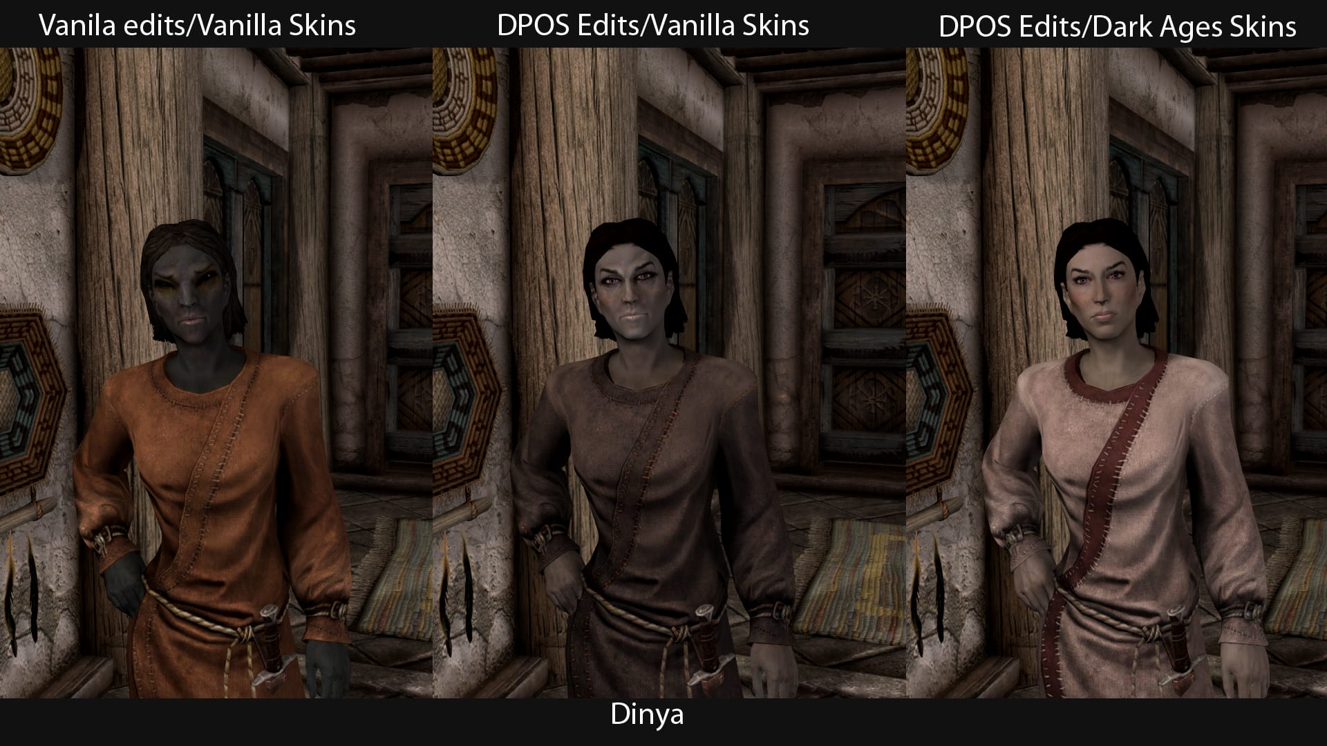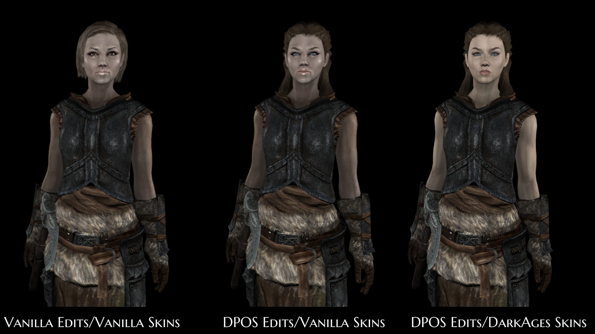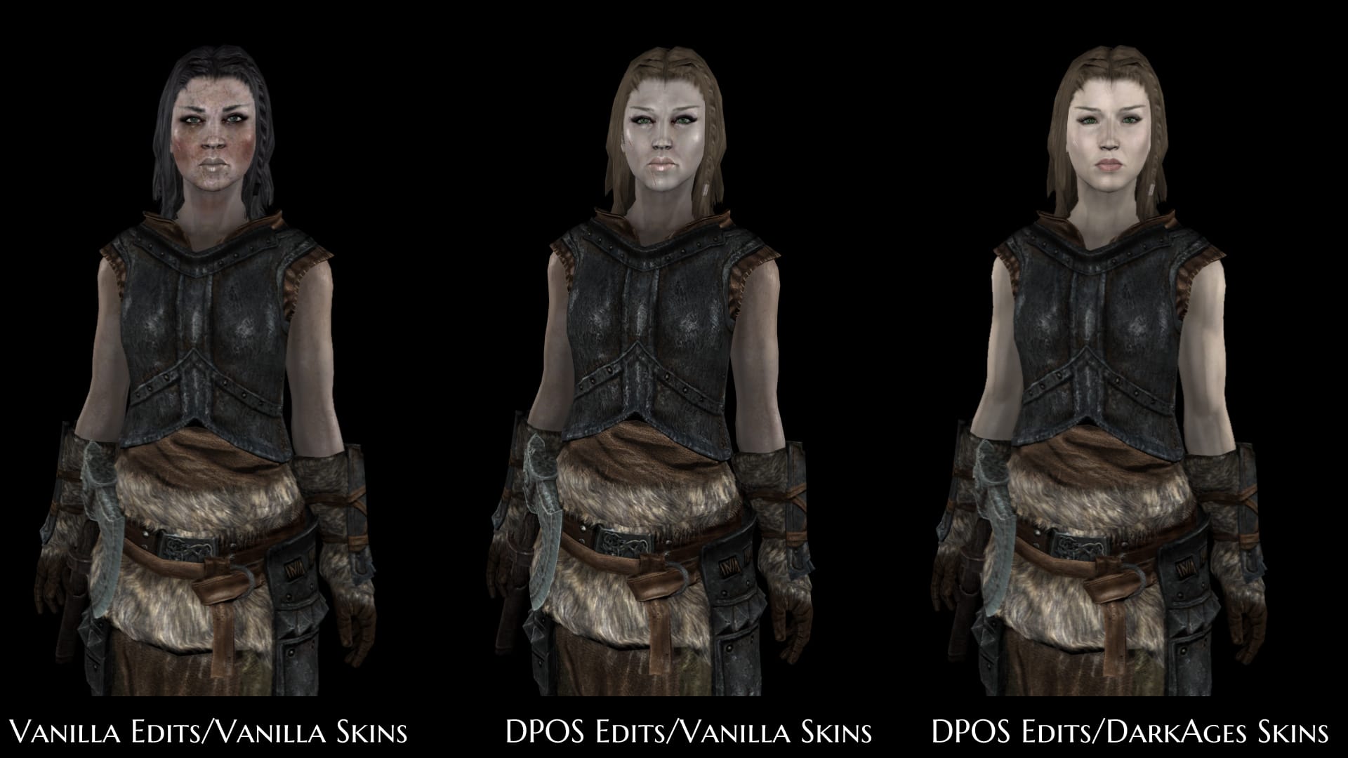 In the galleries below there are showcases of what DPOS does with or without skins. The vanilla skins are very opaque and so dirty it’s hard to get a grasp on your actual options. Dark Ages Skins was chosen to display the range of options due to the fact it offers zero pixelation and faux smudges so you can get a visual idea of how your character can look. As always: DPOS contains no skin textures itself.