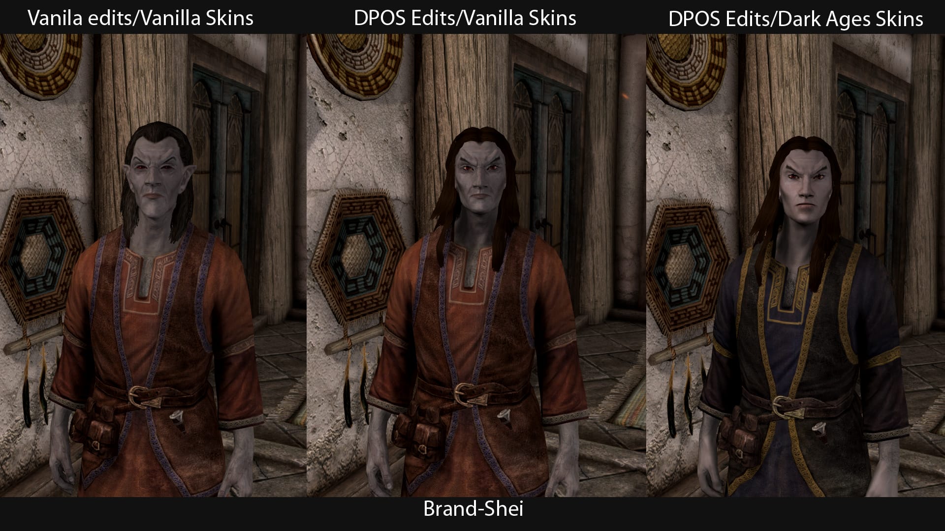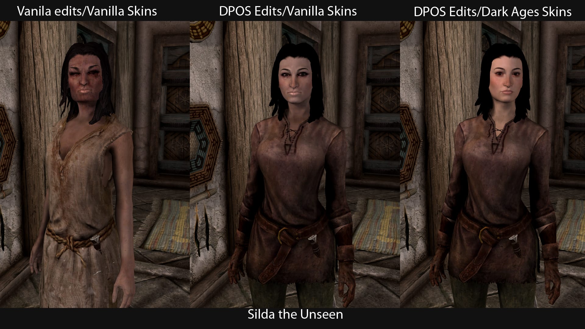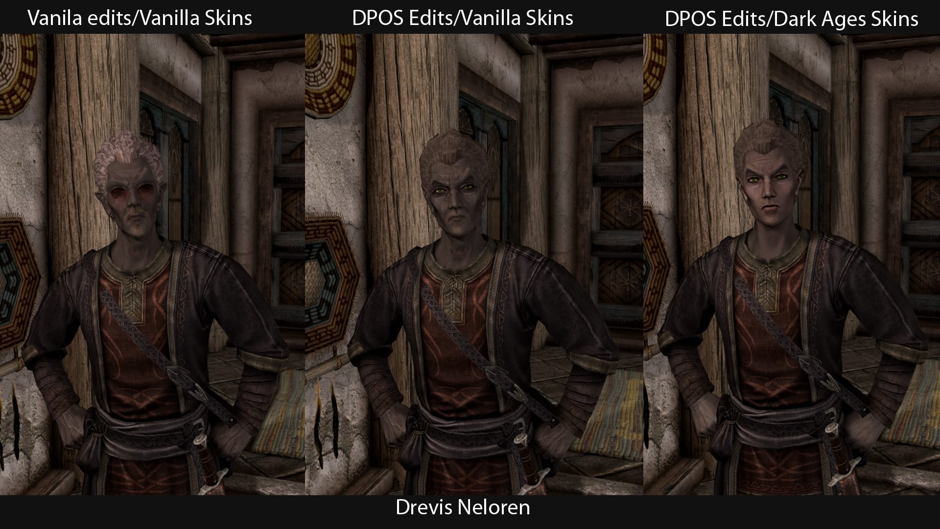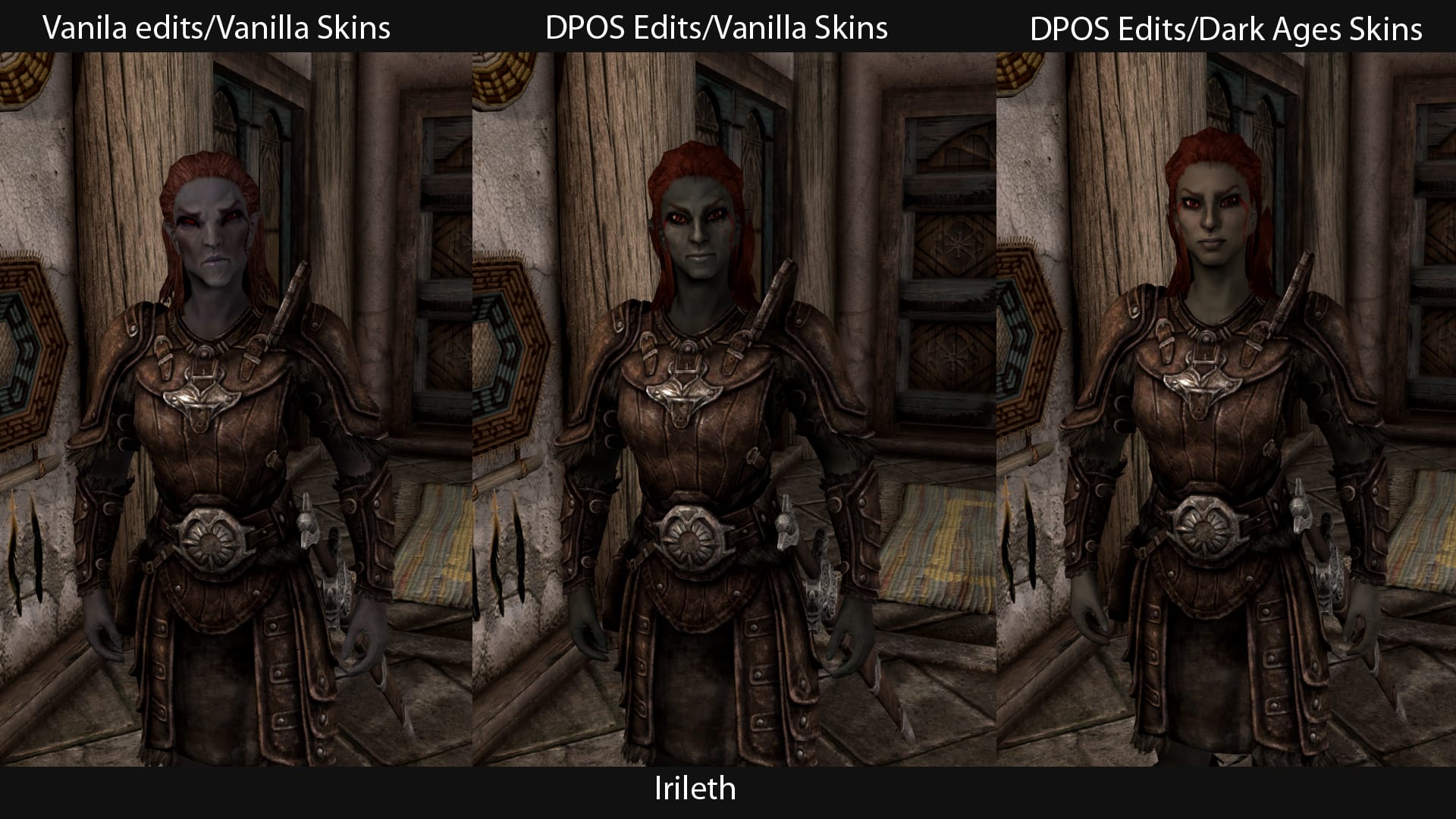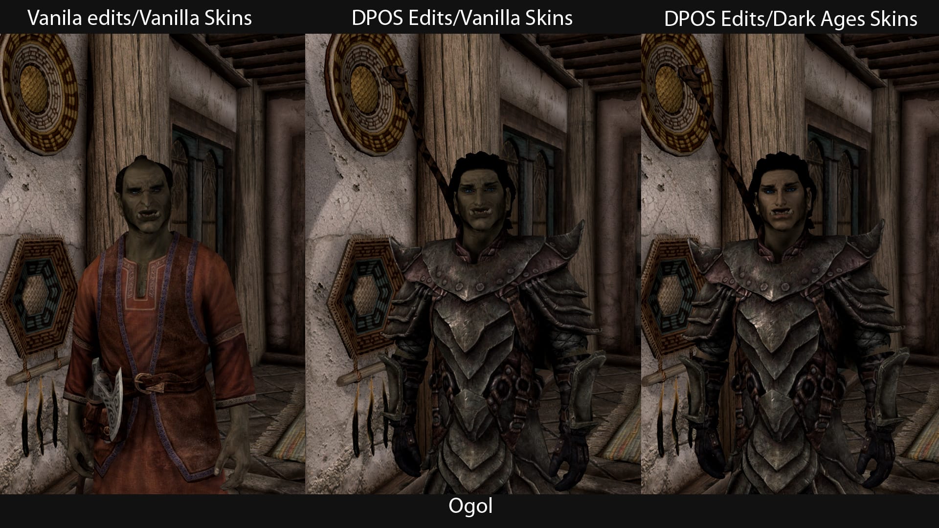 In the galleries below there are showcases of what DPOS does with or without skins. The vanilla skins are very opaque and so dirty it’s hard to get a grasp on your actual options. Dark Ages Skins was chosen to display the range of options due to the fact it offers zero pixelation and faux smudges so you can get a visual idea of how your character can look. As always: DPOS contains no skin textures itself.