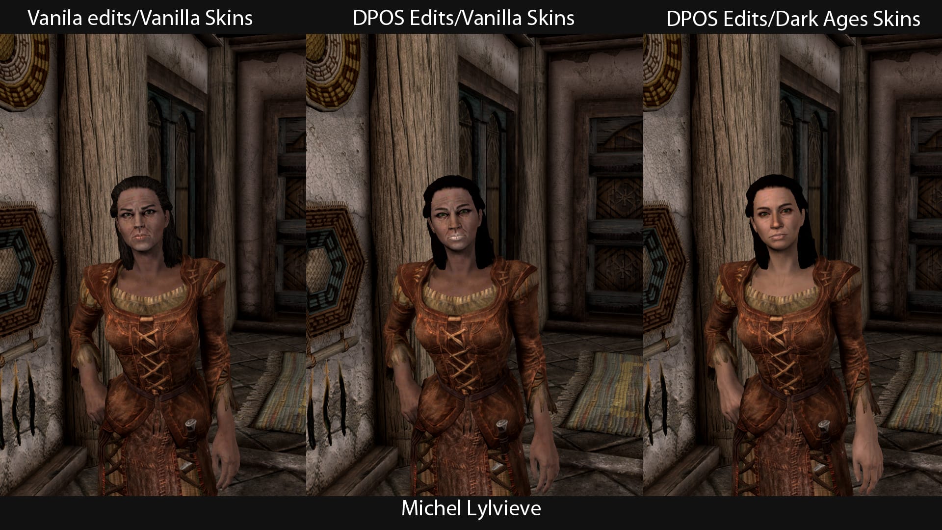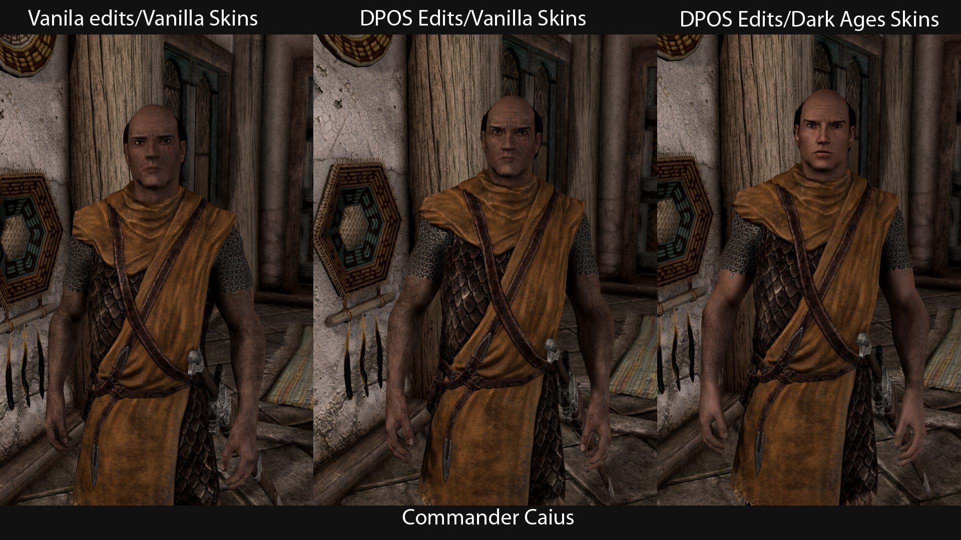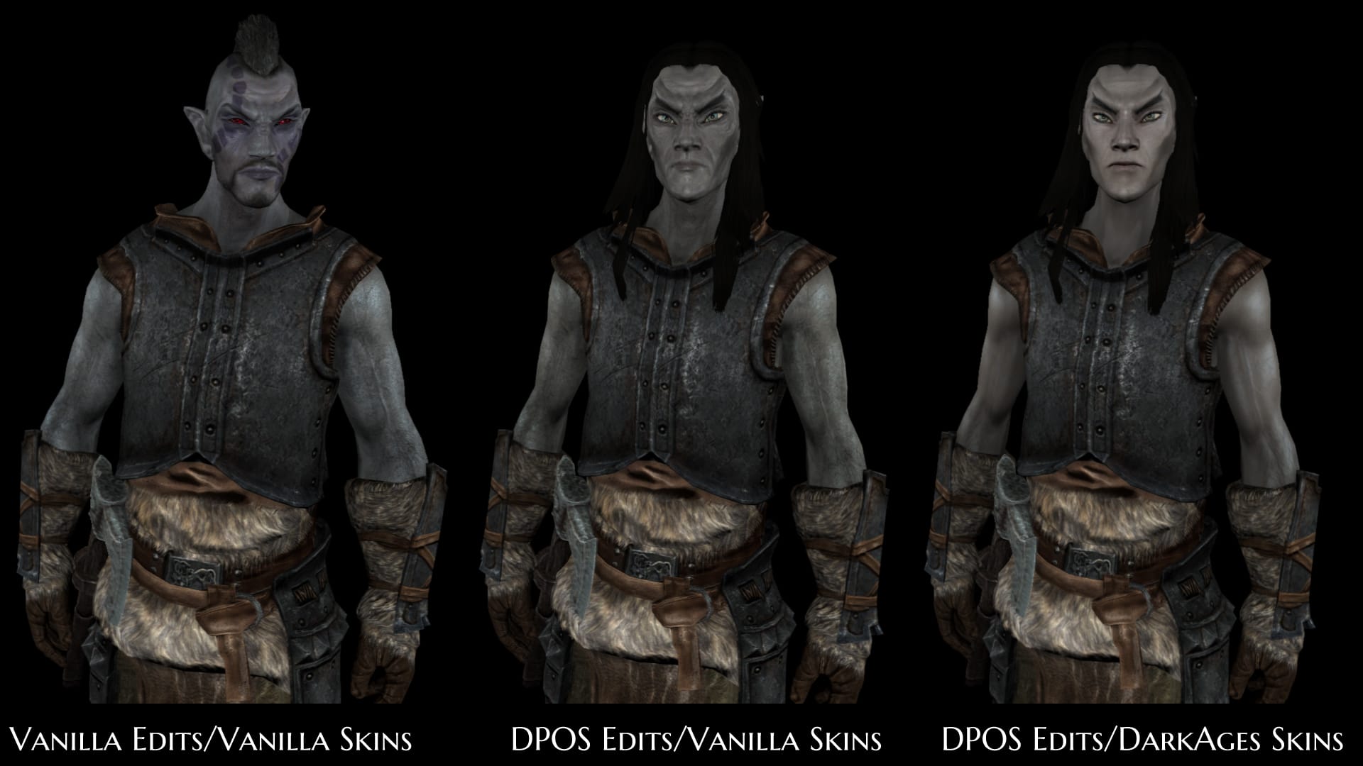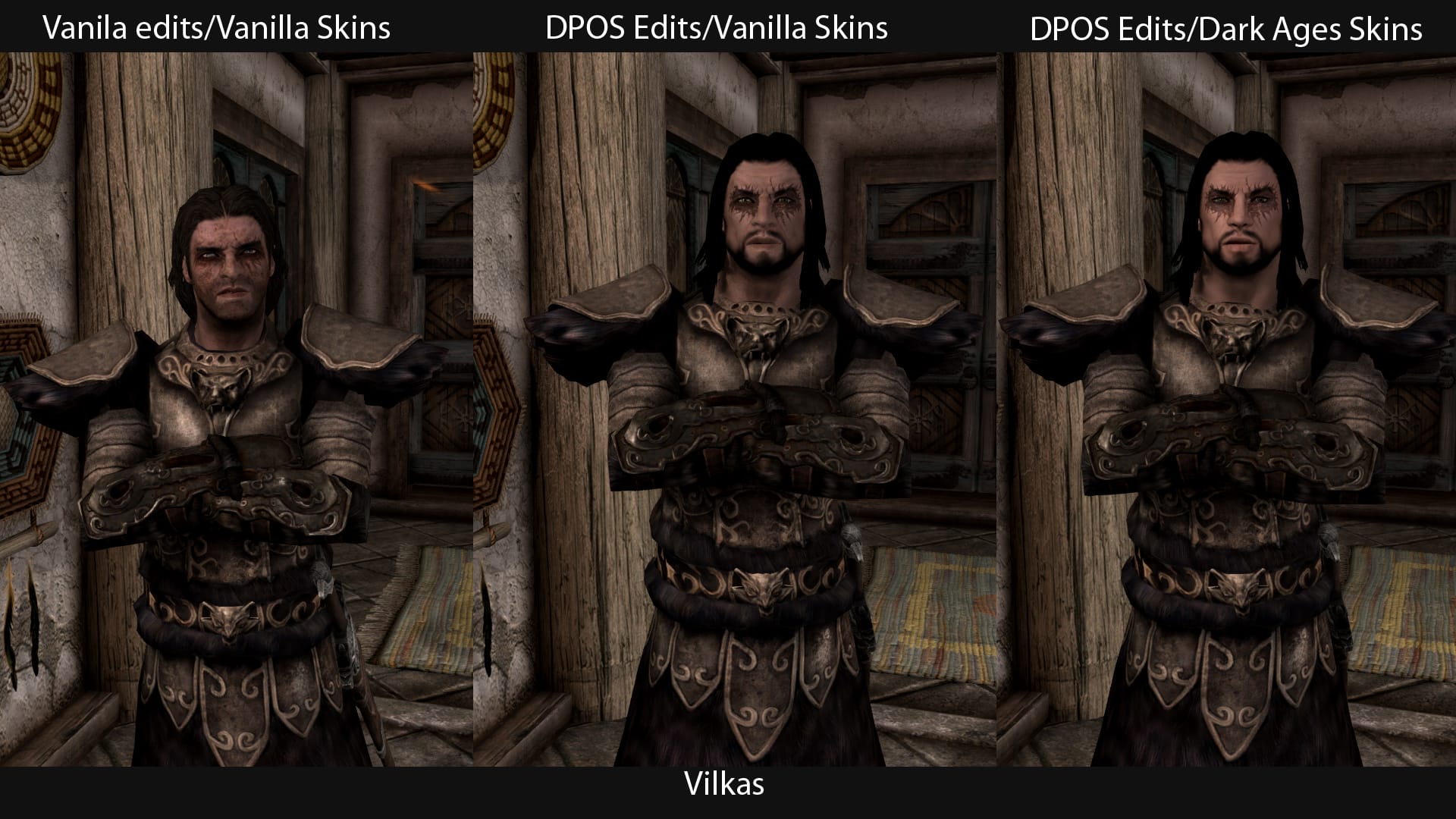 In the galleries below there are showcases of what DPOS does with or without skins. The vanilla skins are very opaque and so dirty it’s hard to get a grasp on your actual options. Dark Ages Skins was chosen to display the range of options due to the fact it offers zero pixelation and faux smudges so you can get a visual idea of how your character can look. As always: DPOS contains no skin textures itself.