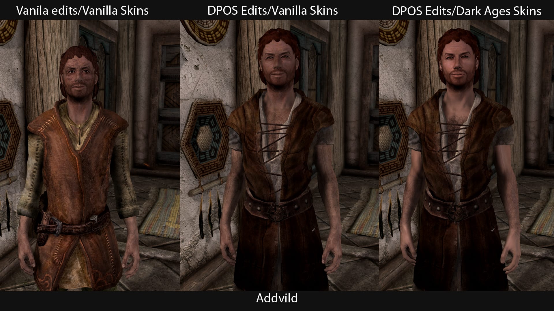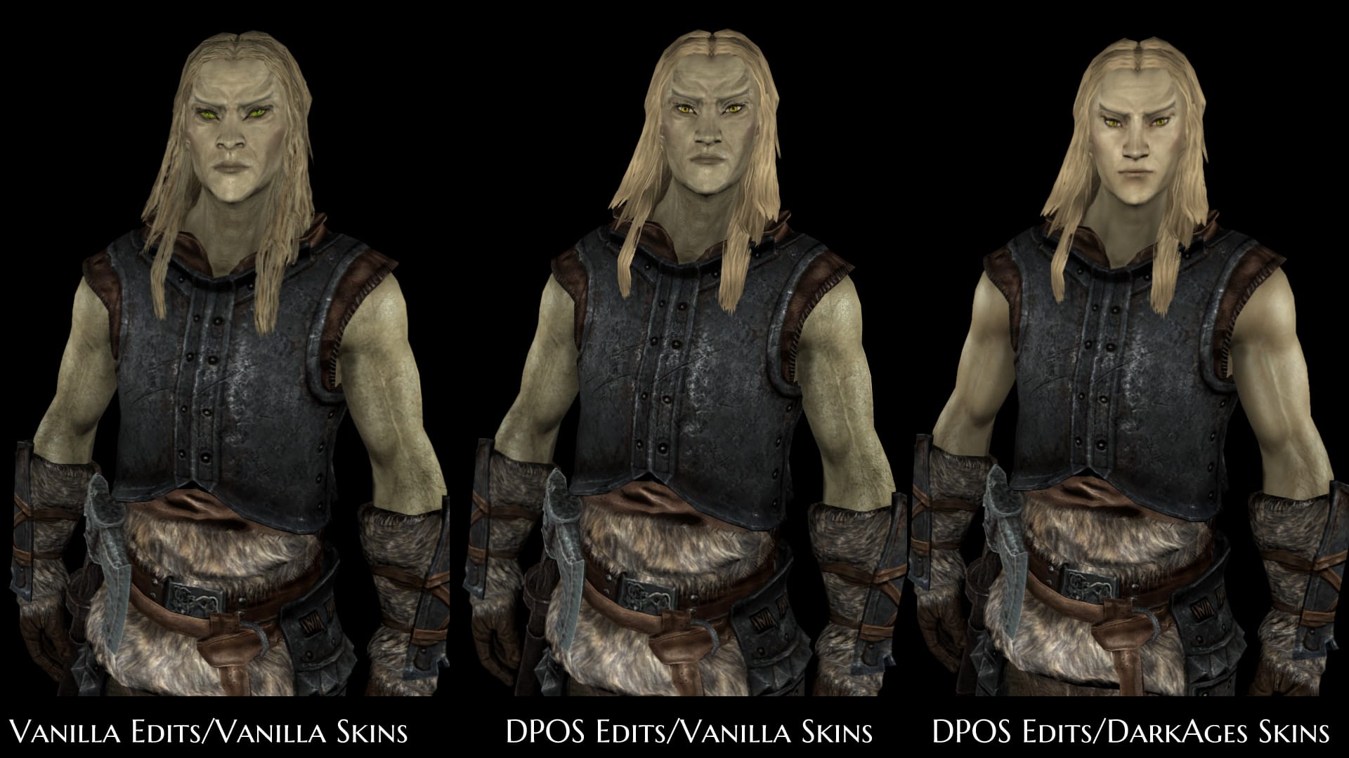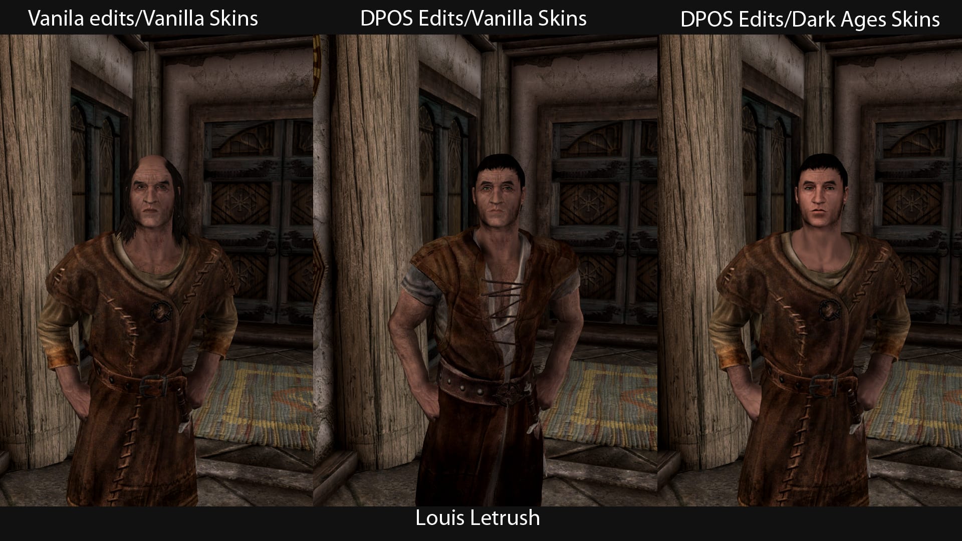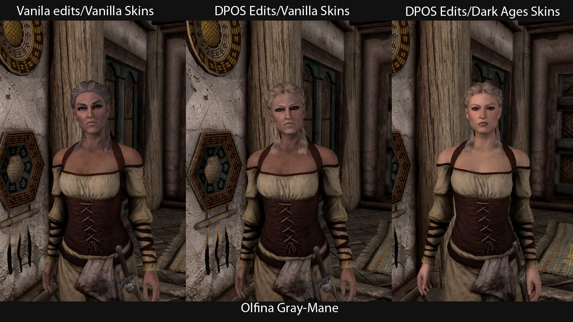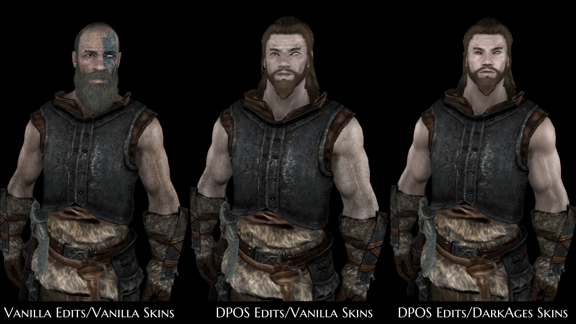 In the galleries below there are showcases of what DPOS does with or without skins. The vanilla skins are very opaque and so dirty it’s hard to get a grasp on your actual options. Dark Ages Skins was chosen to display the range of options due to the fact it offers zero pixelation and faux smudges so you can get a visual idea of how your character can look. As always: DPOS contains no skin textures itself.