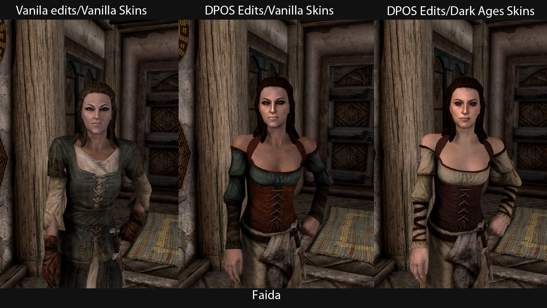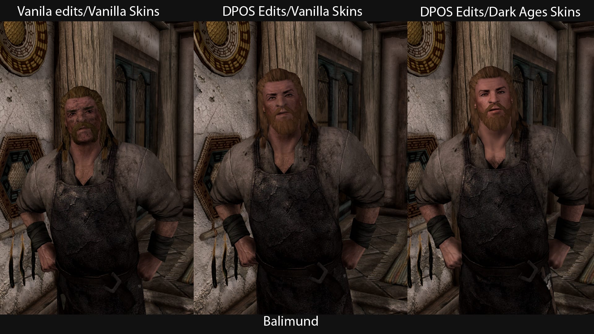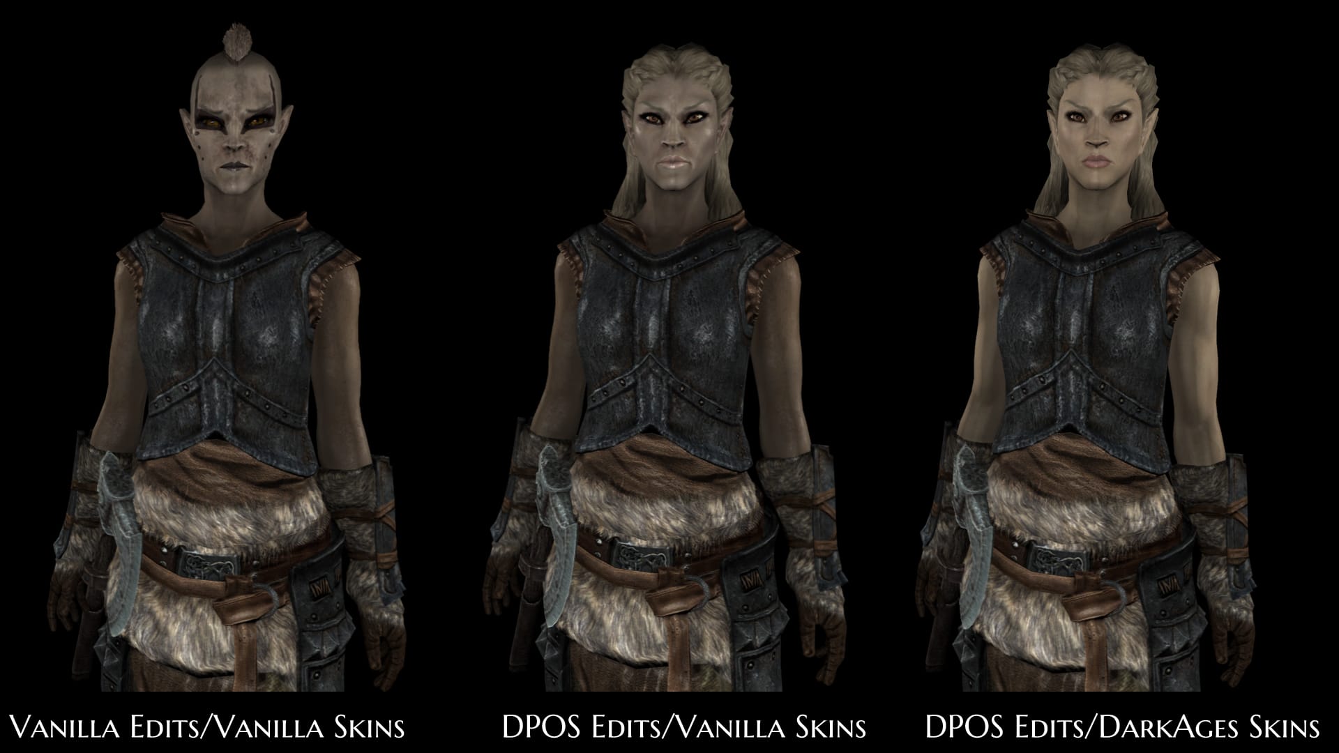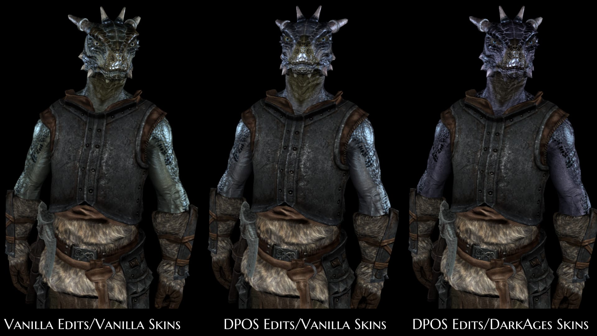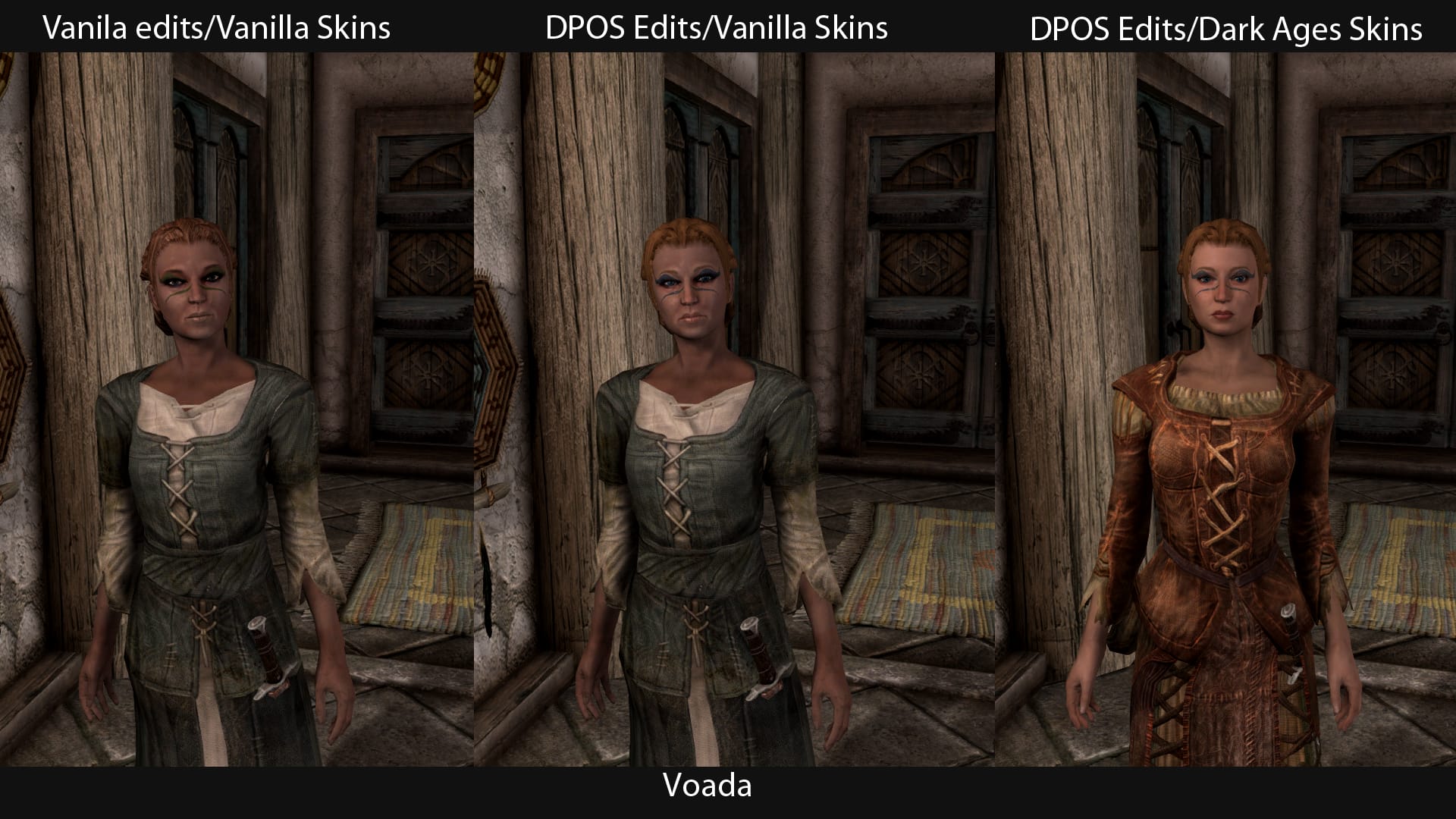 In the galleries below there are showcases of what DPOS does with or without skins. The vanilla skins are very opaque and so dirty it’s hard to get a grasp on your actual options. Dark Ages Skins was chosen to display the range of options due to the fact it offers zero pixelation and faux smudges so you can get a visual idea of how your character can look. As always: DPOS contains no skin textures itself.