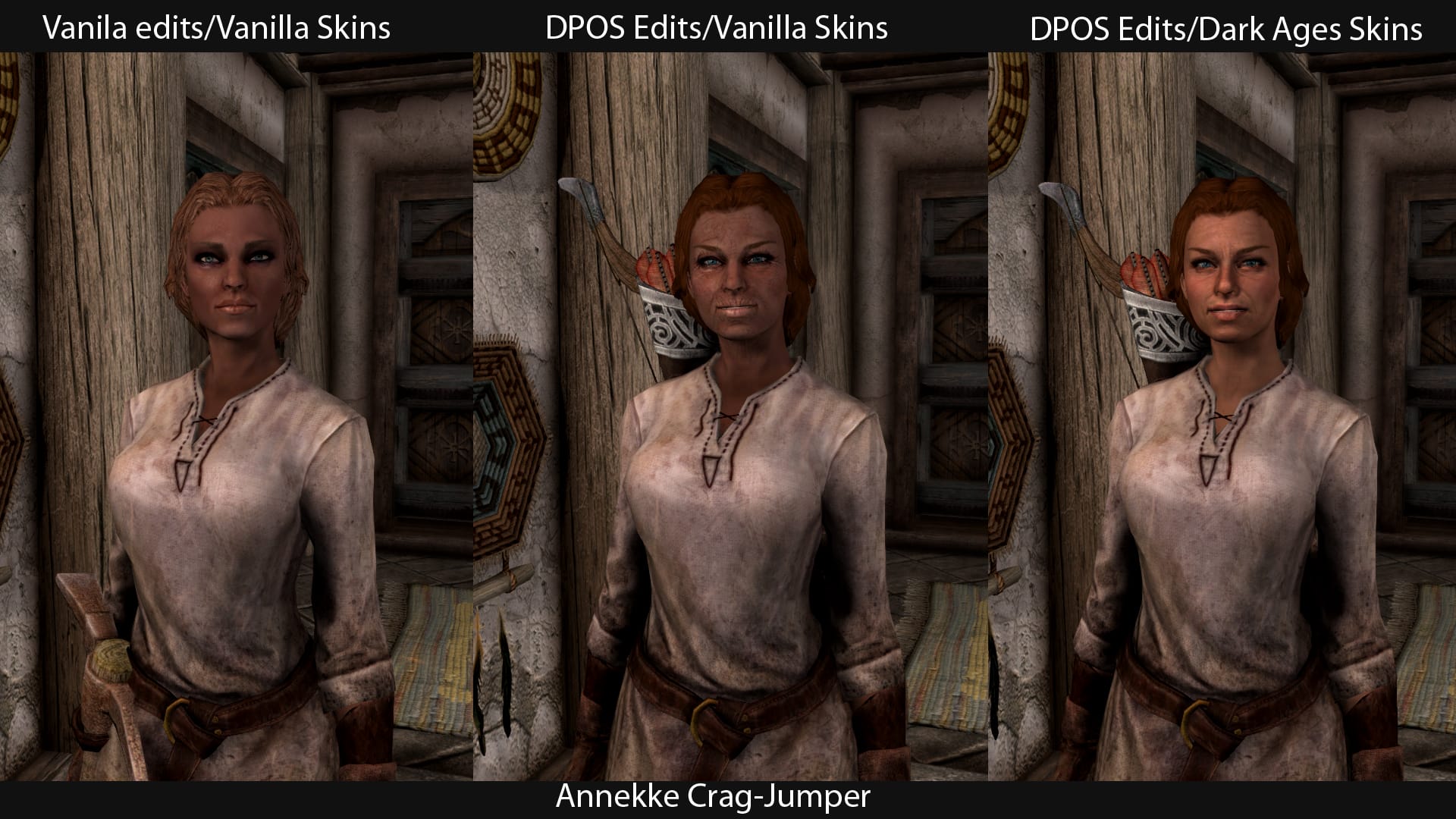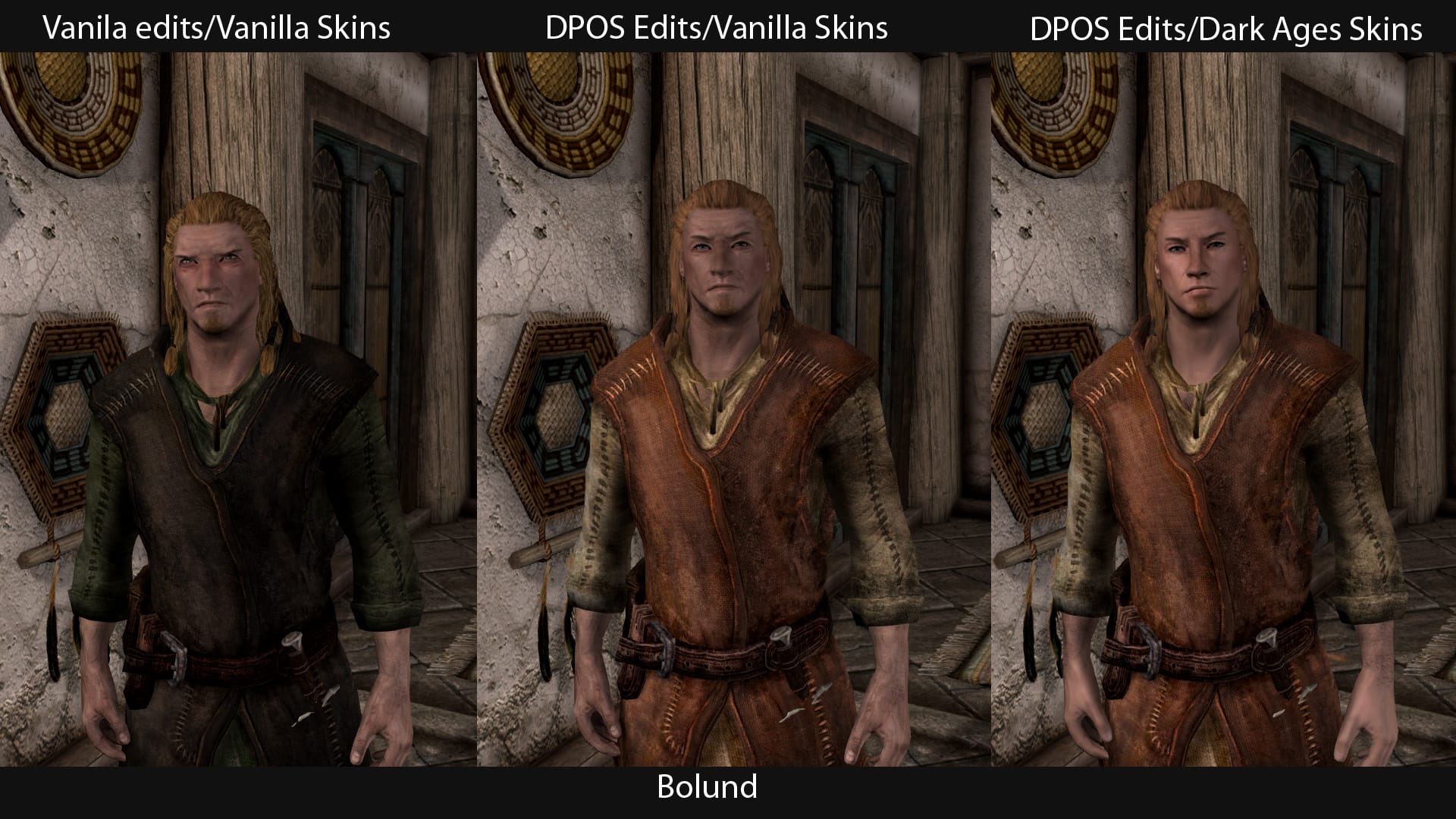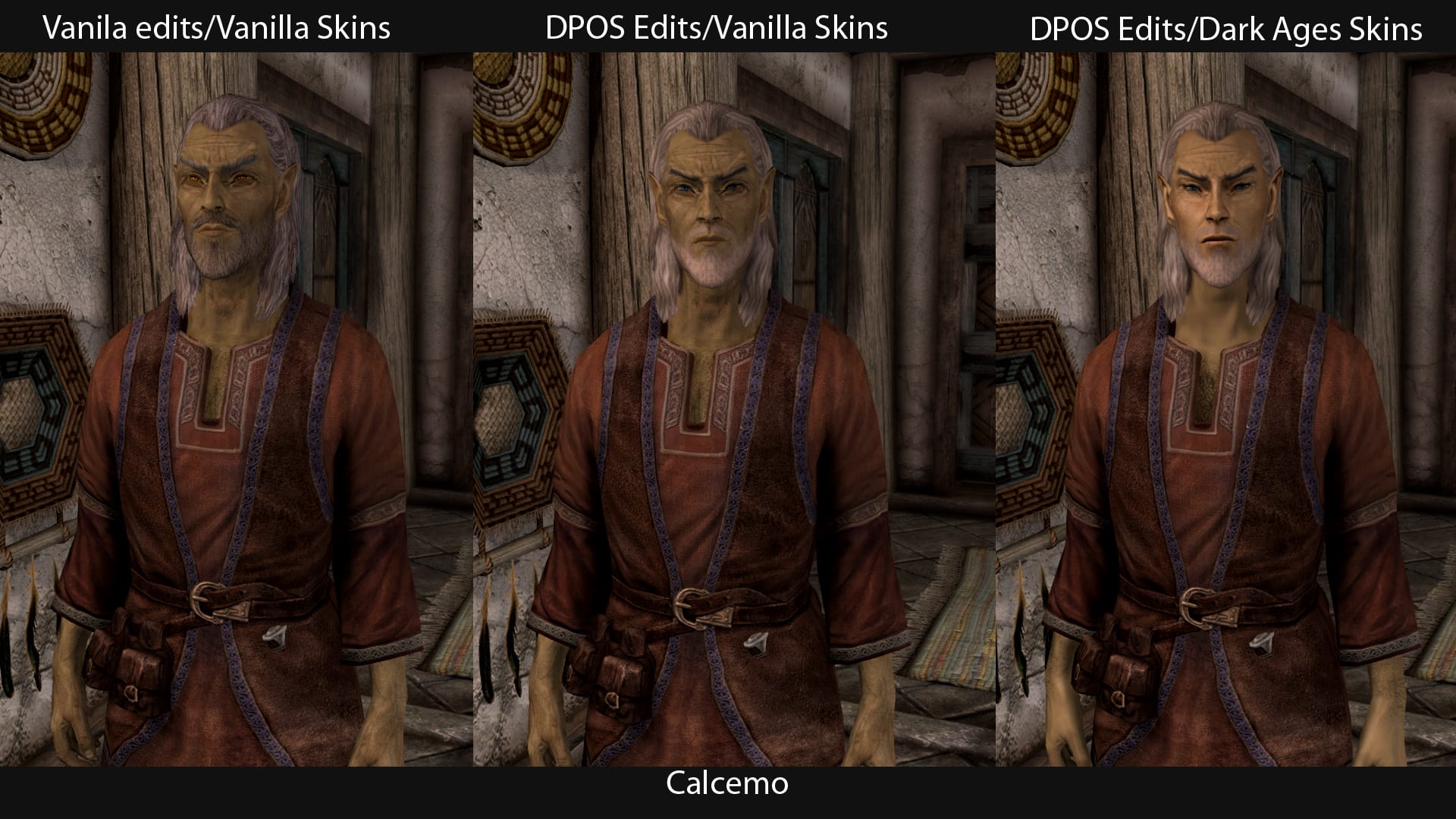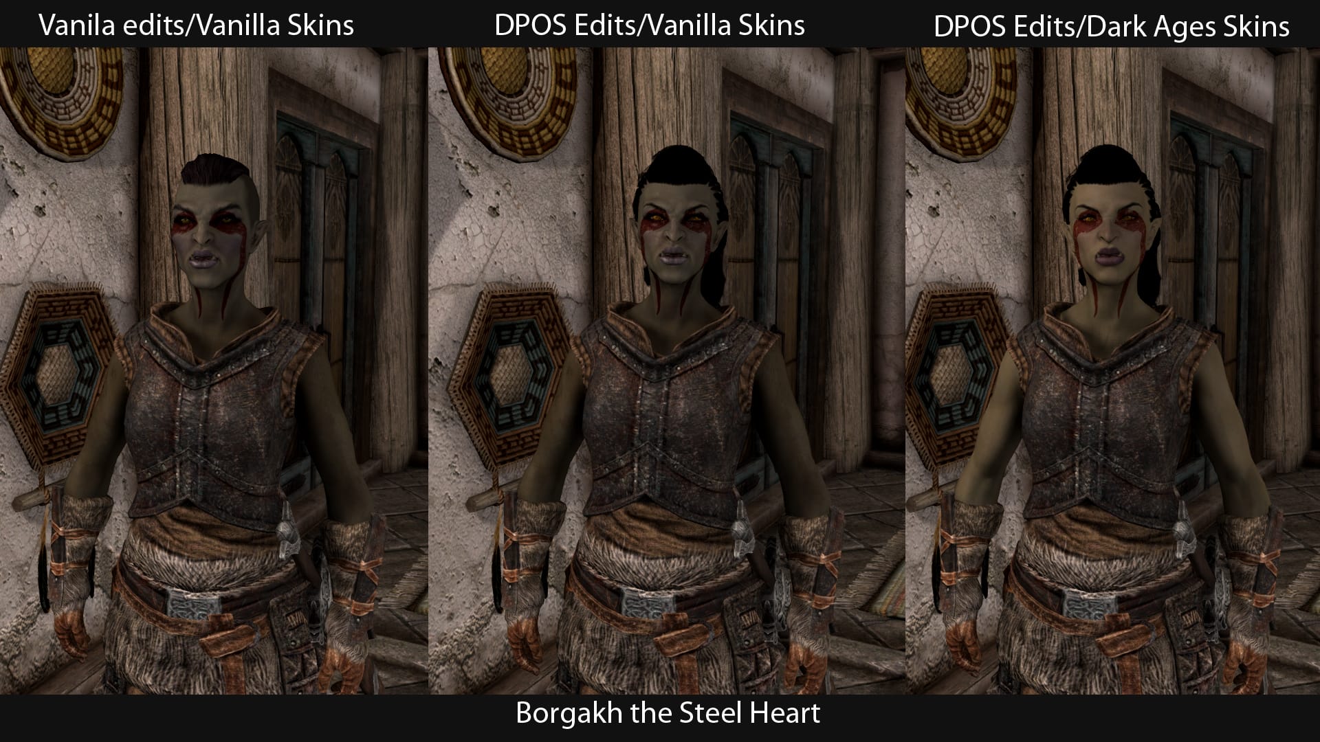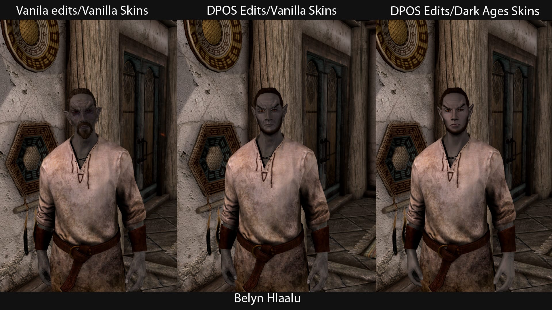 In the galleries below there are showcases of what DPOS does with or without skins. The vanilla skins are very opaque and so dirty it’s hard to get a grasp on your actual options. Dark Ages Skins was chosen to display the range of options due to the fact it offers zero pixelation and faux smudges so you can get a visual idea of how your character can look. As always: DPOS contains no skin textures itself.