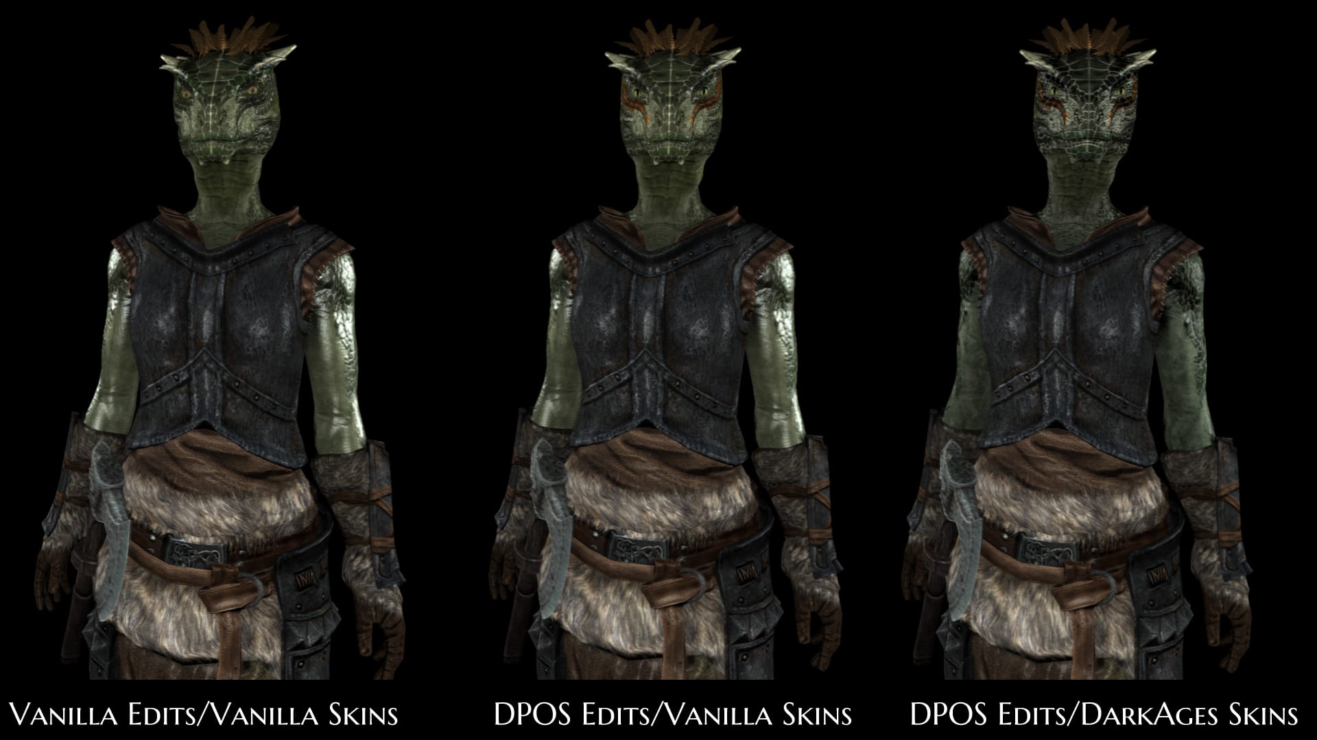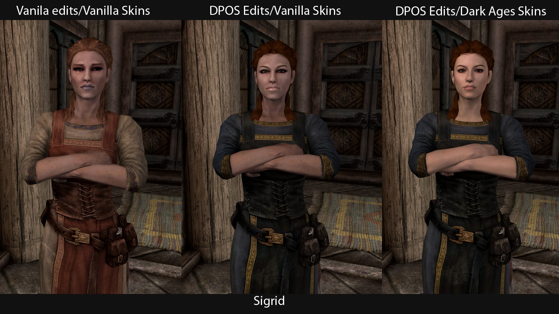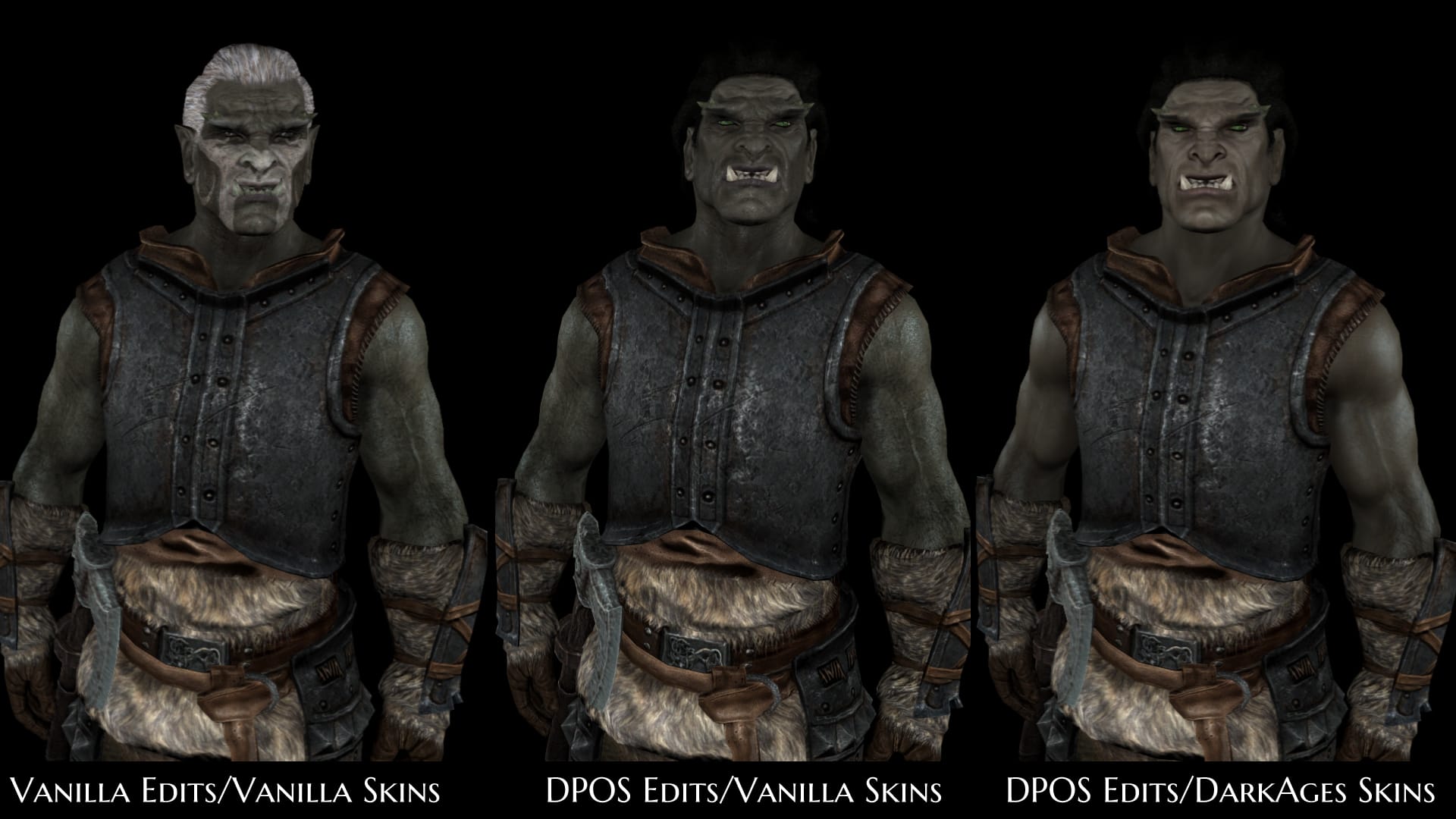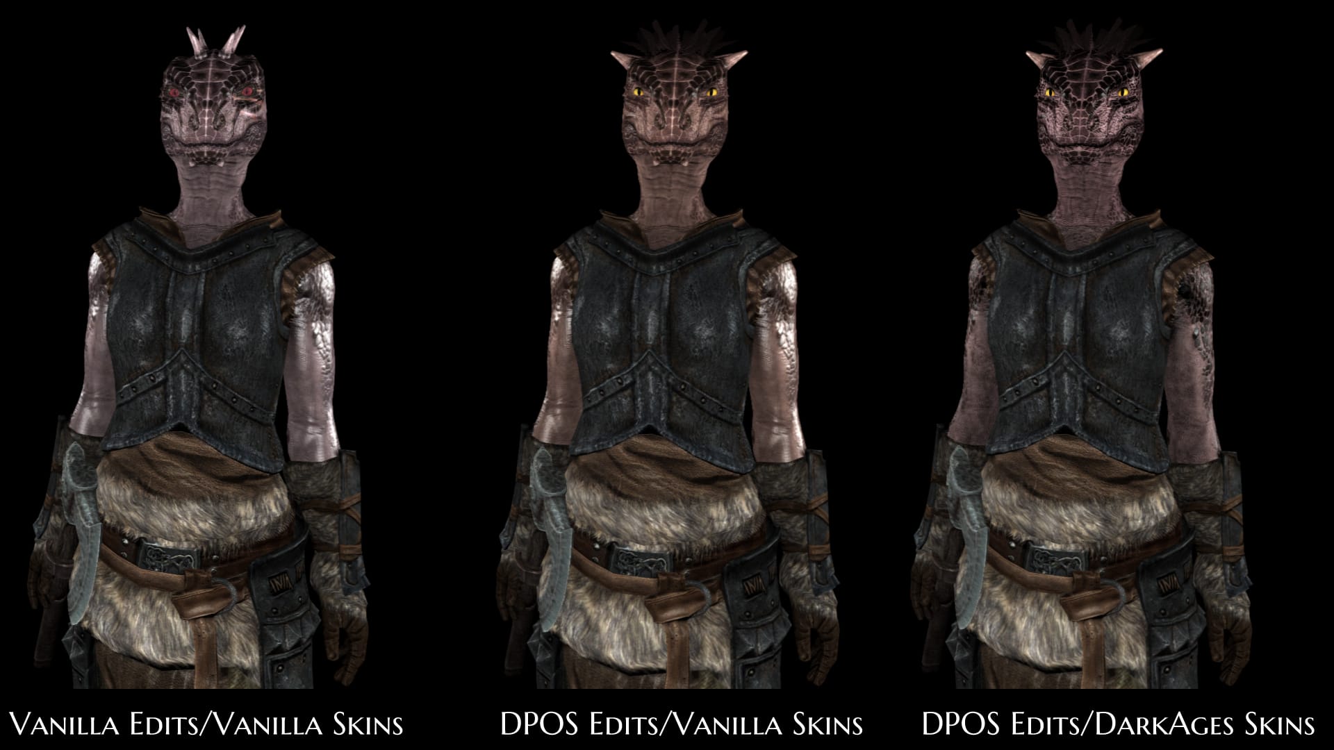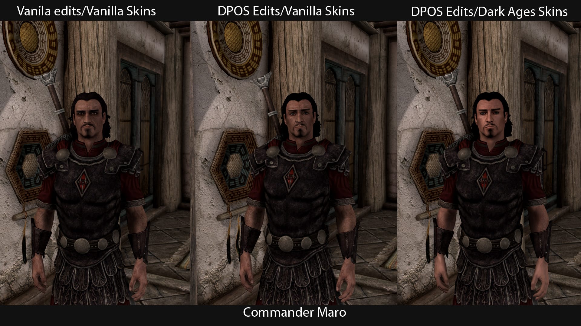 In the galleries below there are showcases of what DPOS does with or without skins. The vanilla skins are very opaque and so dirty it’s hard to get a grasp on your actual options. Dark Ages Skins was chosen to display the range of options due to the fact it offers zero pixelation and faux smudges so you can get a visual idea of how your character can look. As always: DPOS contains no skin textures itself.