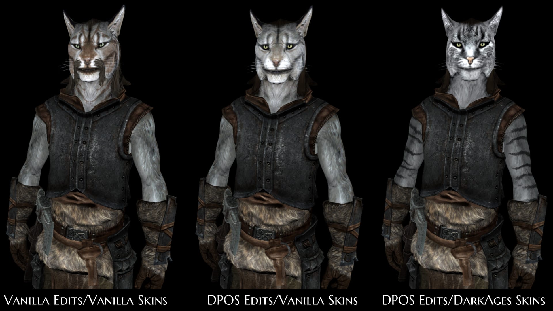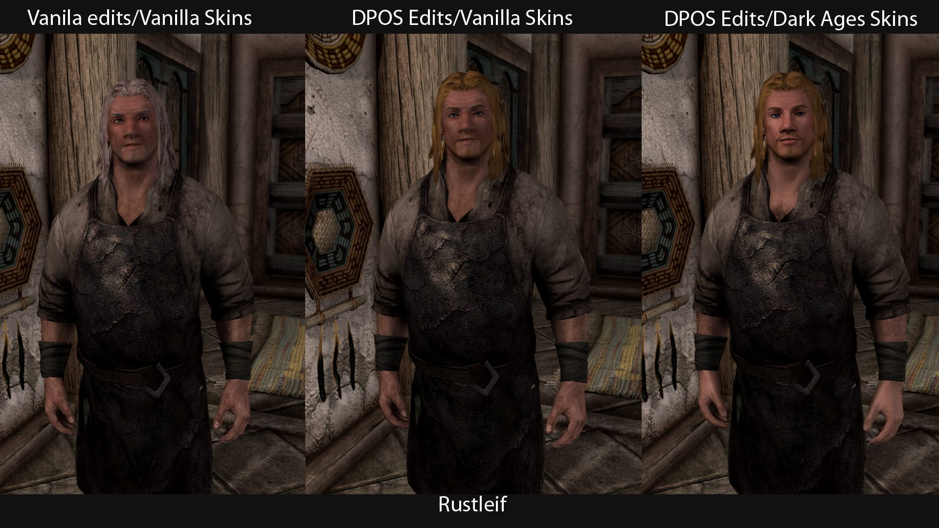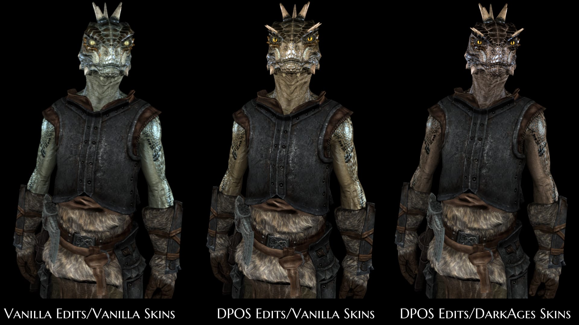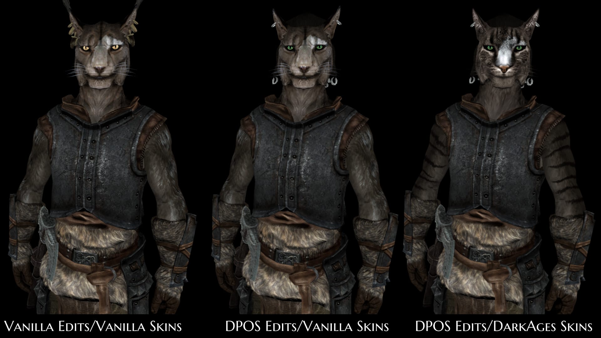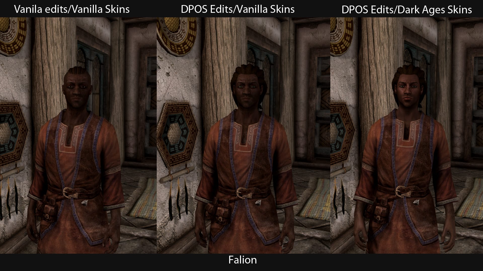 In the galleries below there are showcases of what DPOS does with or without skins. The vanilla skins are very opaque and so dirty it’s hard to get a grasp on your actual options. Dark Ages Skins was chosen to display the range of options due to the fact it offers zero pixelation and faux smudges so you can get a visual idea of how your character can look. As always: DPOS contains no skin textures itself.