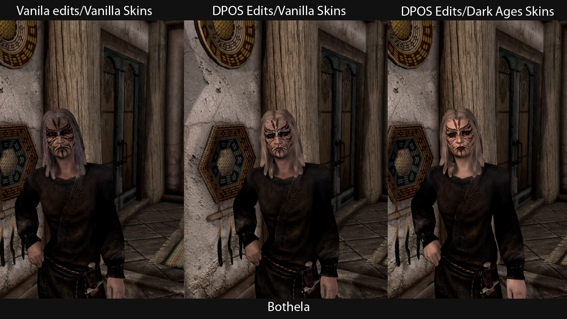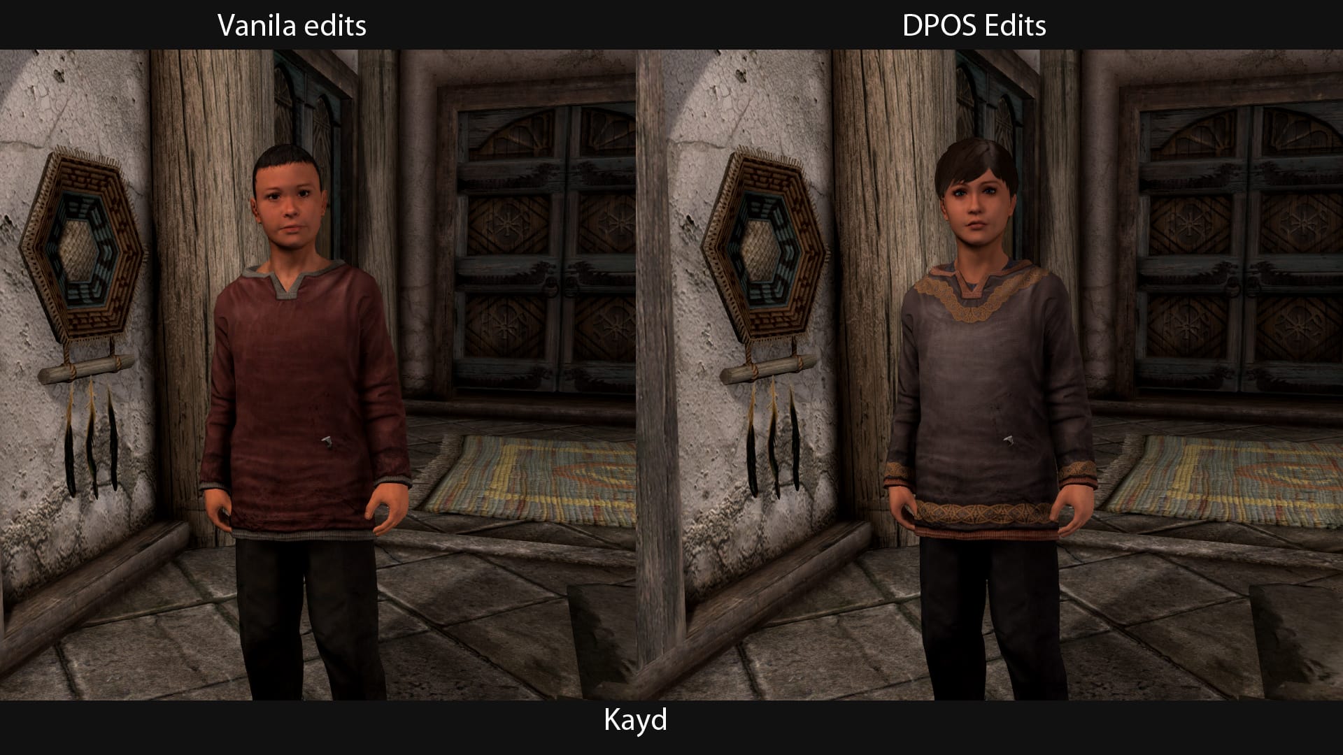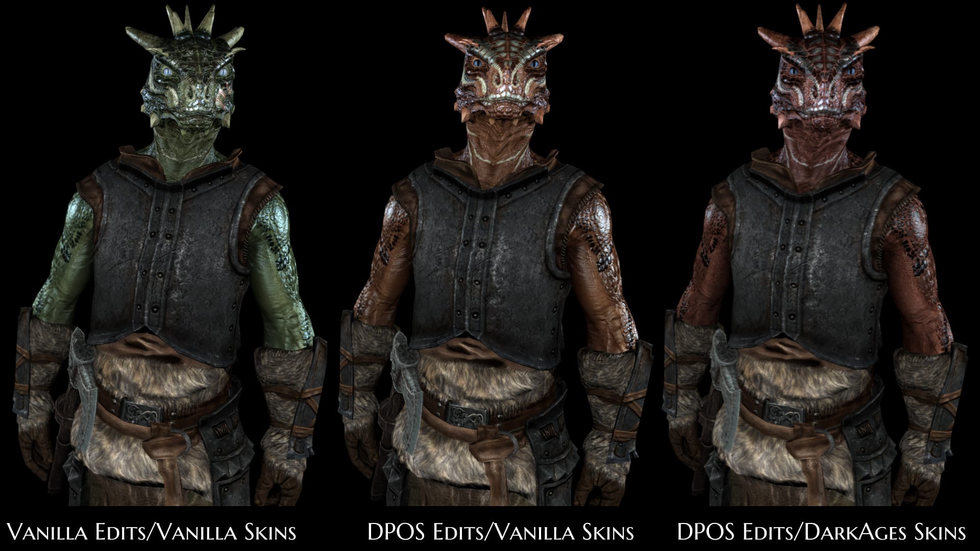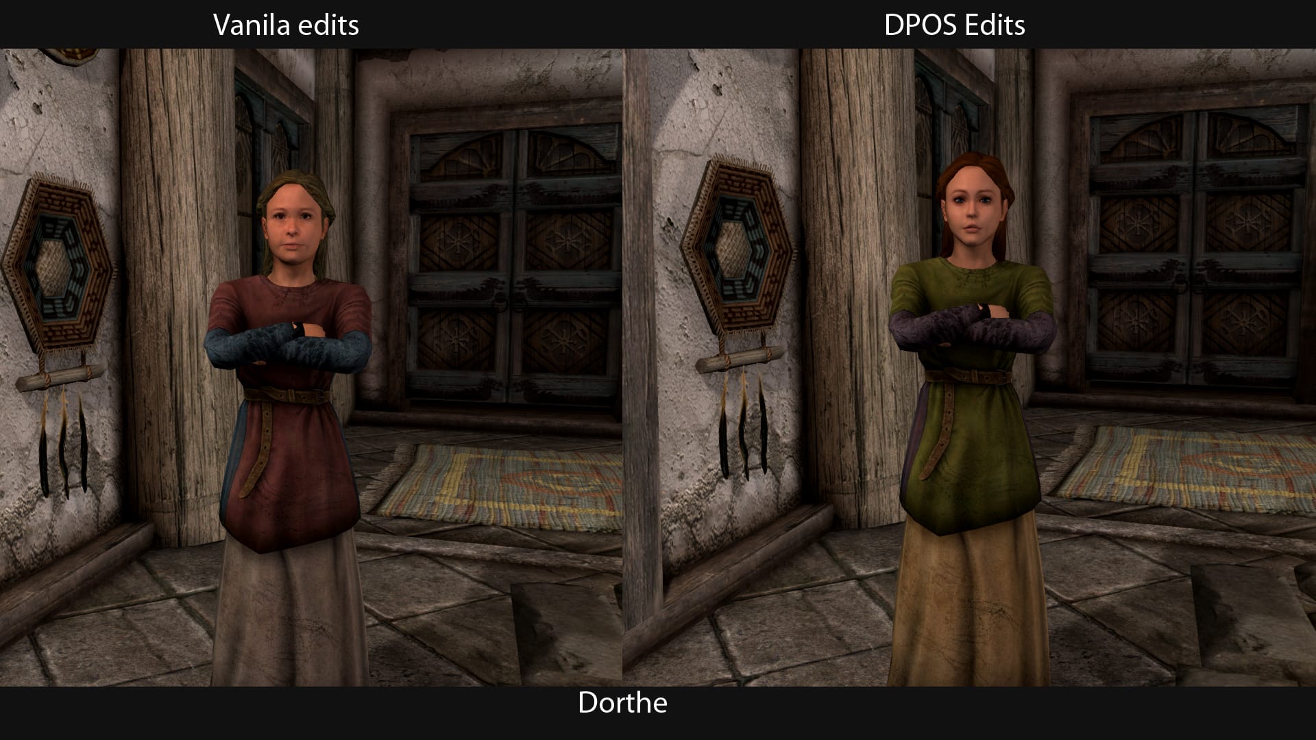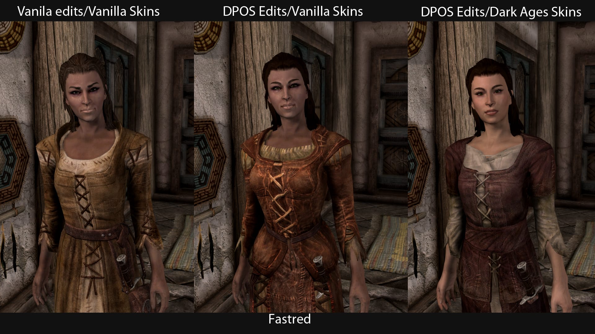 In the galleries below there are showcases of what DPOS does with or without skins. The vanilla skins are very opaque and so dirty it’s hard to get a grasp on your actual options. Dark Ages Skins was chosen to display the range of options due to the fact it offers zero pixelation and faux smudges so you can get a visual idea of how your character can look. As always: DPOS contains no skin textures itself.