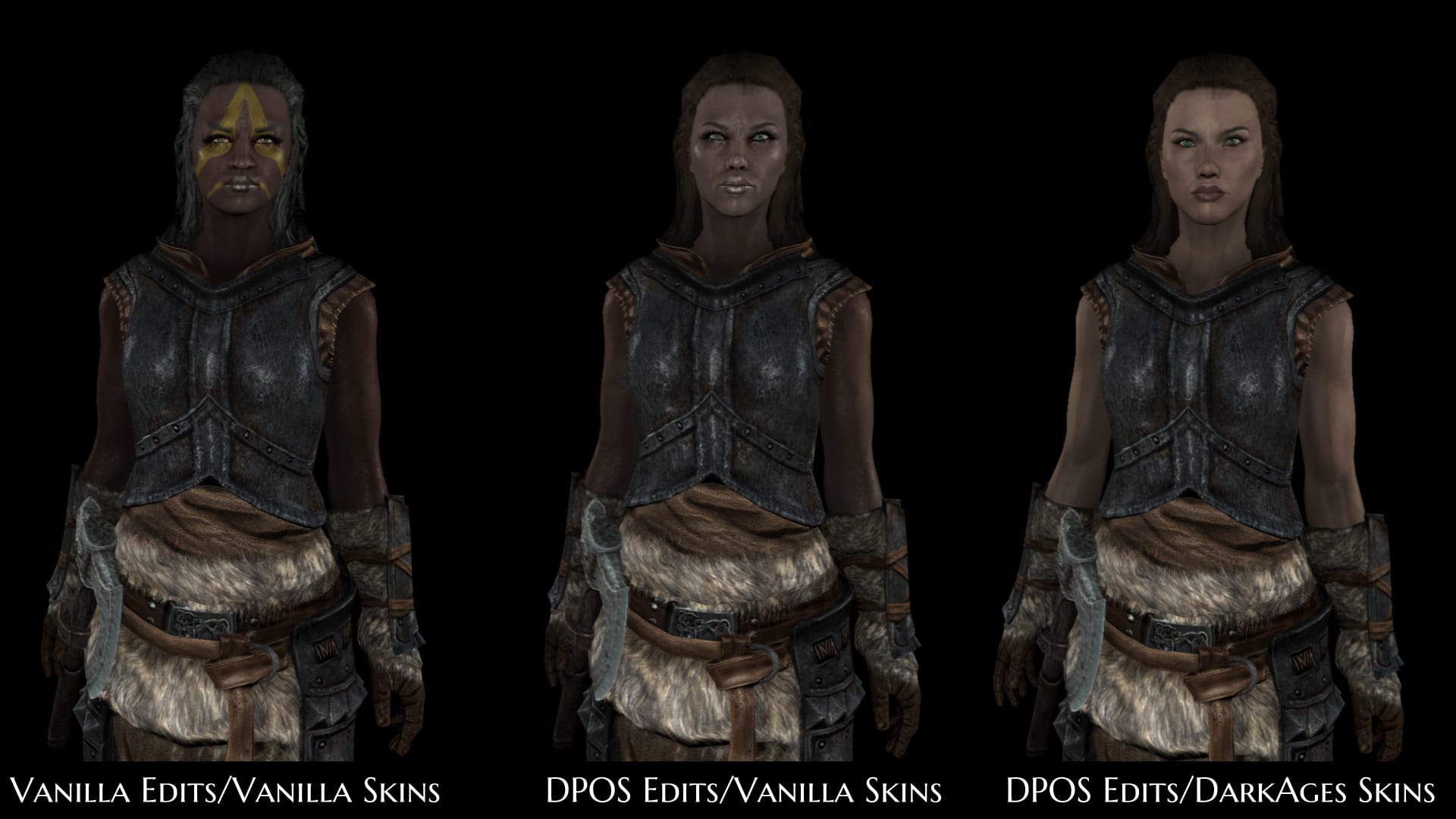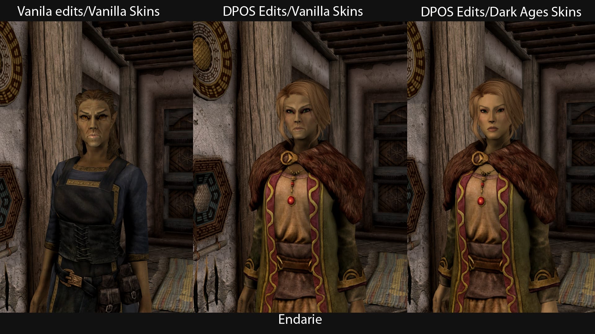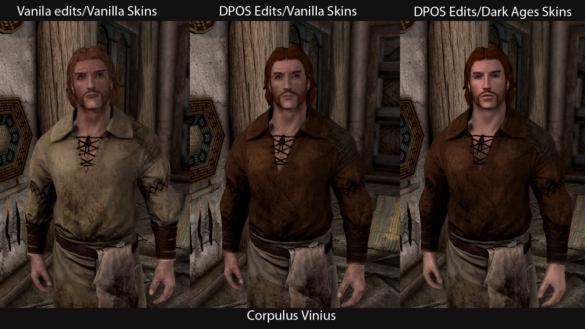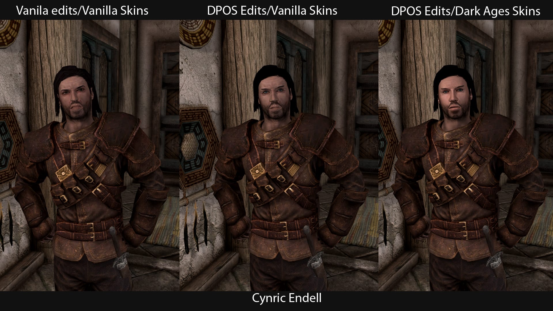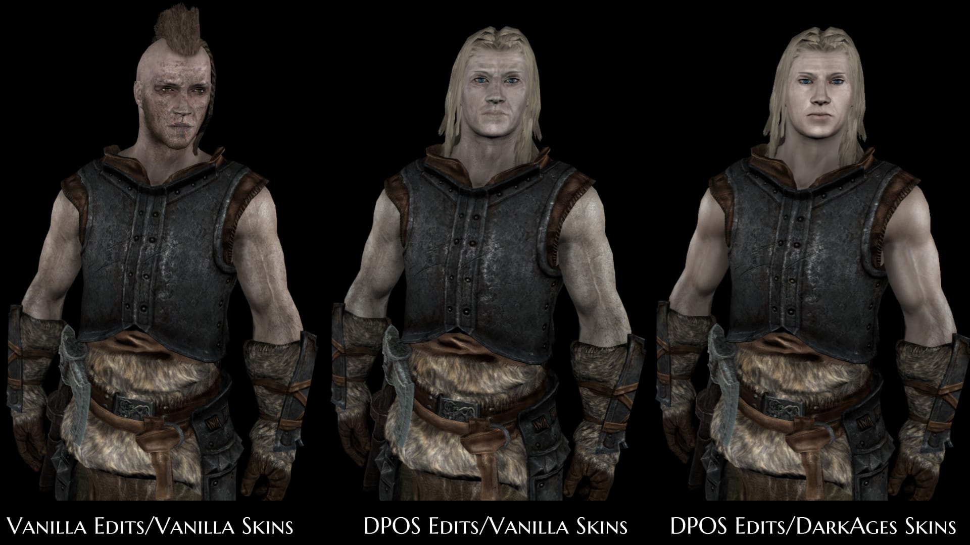 In the galleries below there are showcases of what DPOS does with or without skins. The vanilla skins are very opaque and so dirty it’s hard to get a grasp on your actual options. Dark Ages Skins was chosen to display the range of options due to the fact it offers zero pixelation and faux smudges so you can get a visual idea of how your character can look. As always: DPOS contains no skin textures itself.