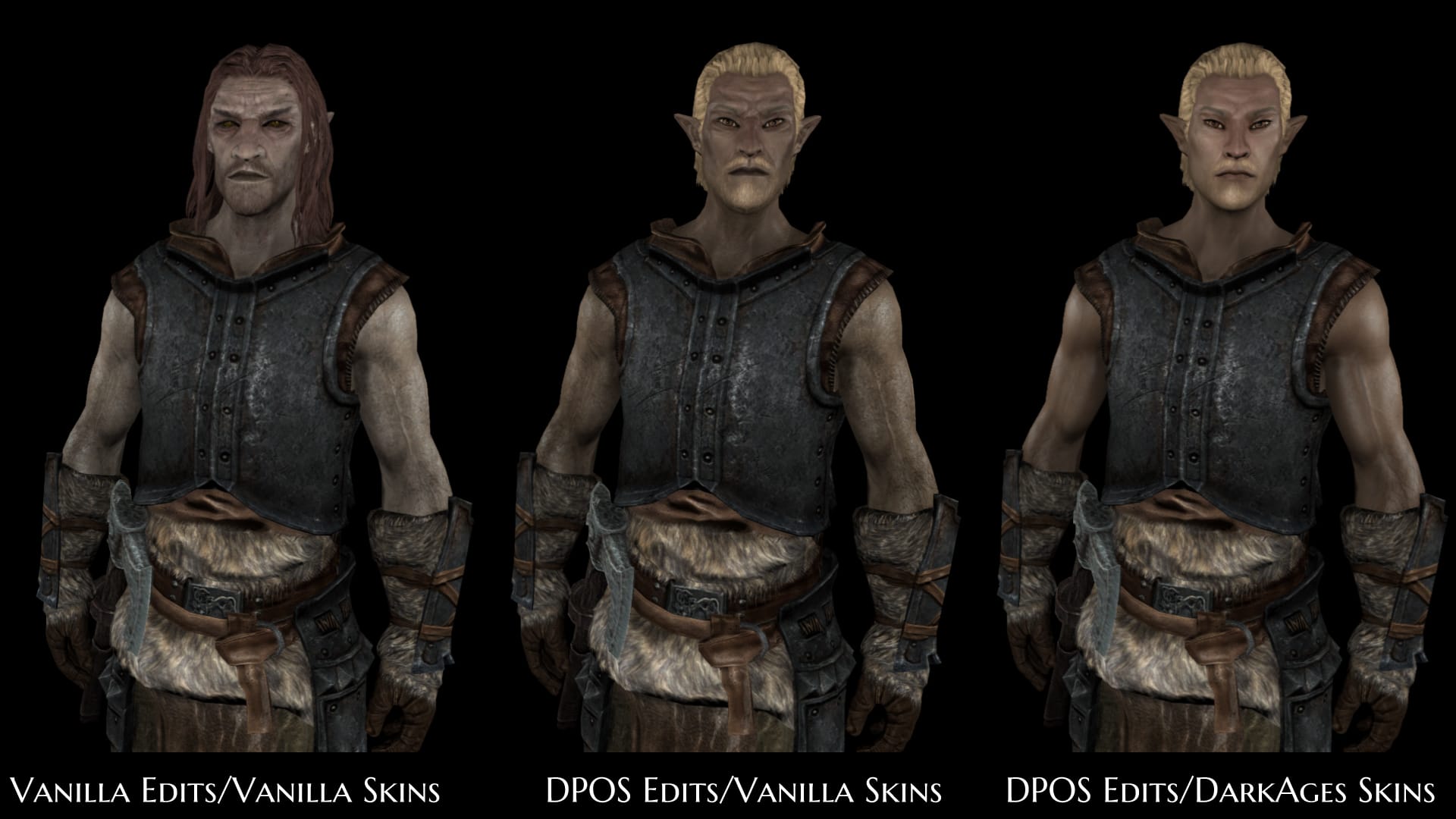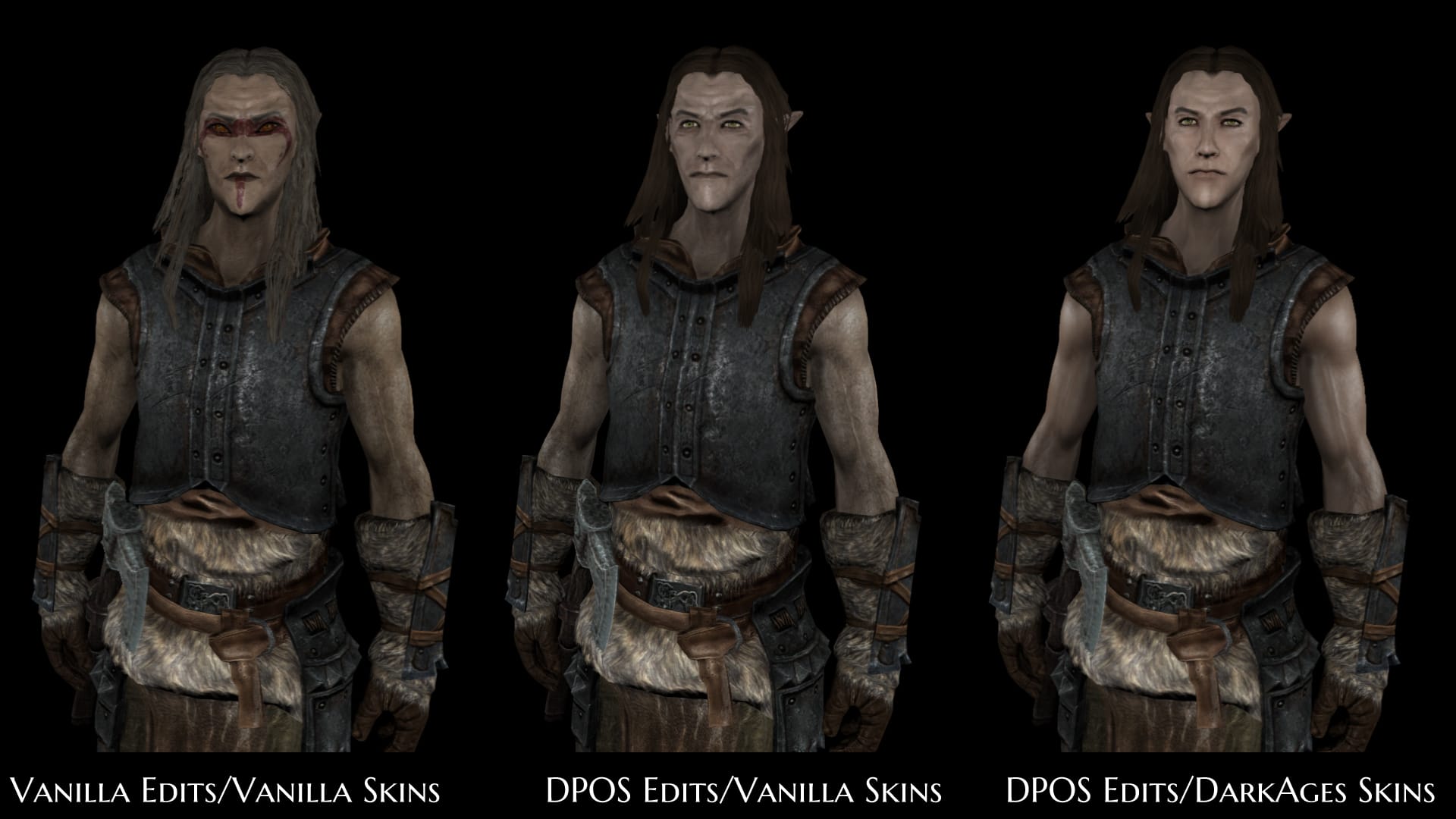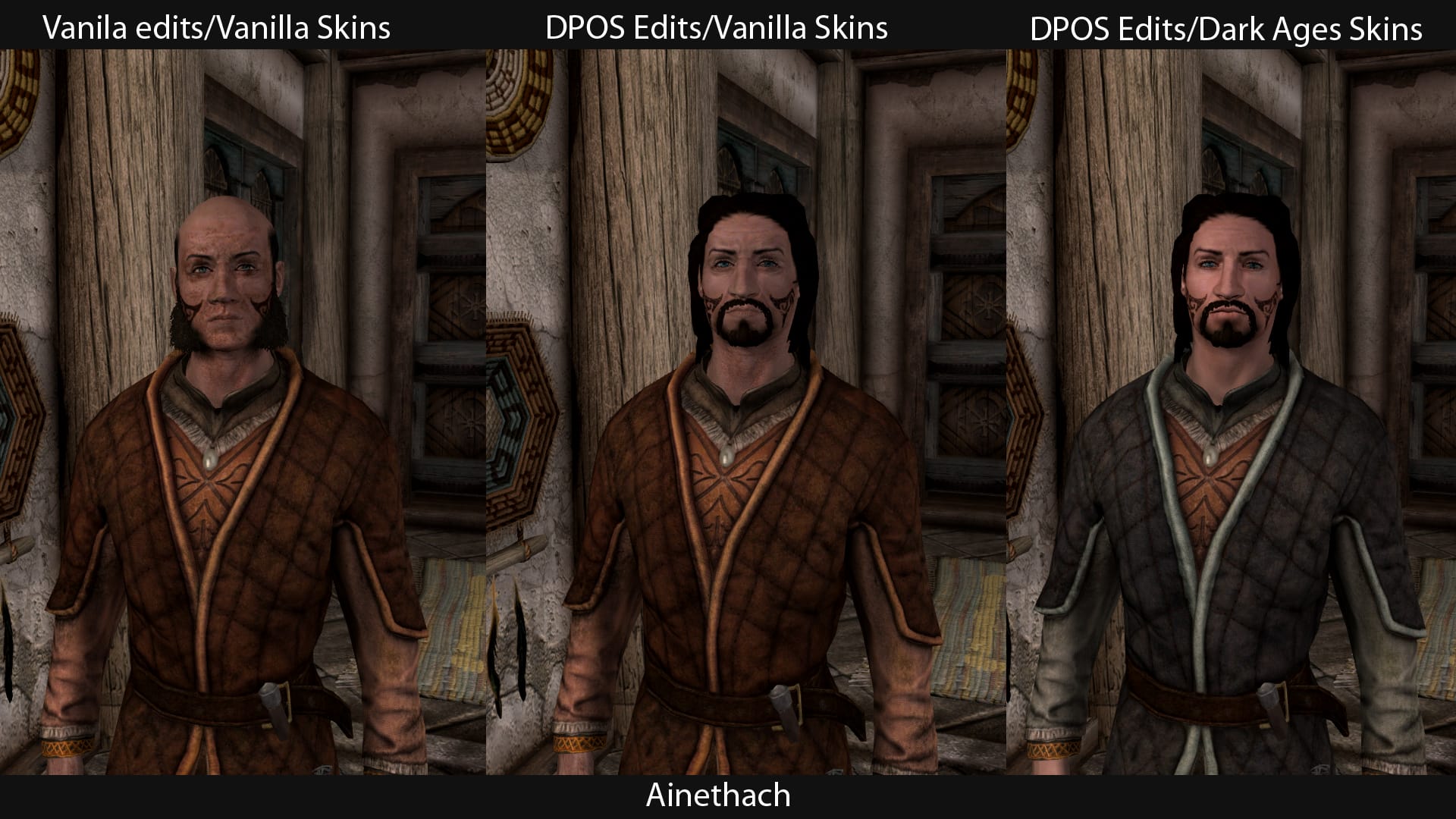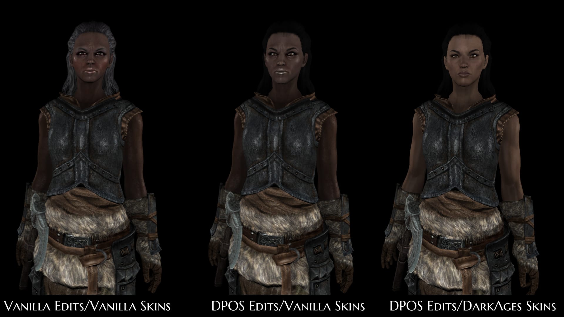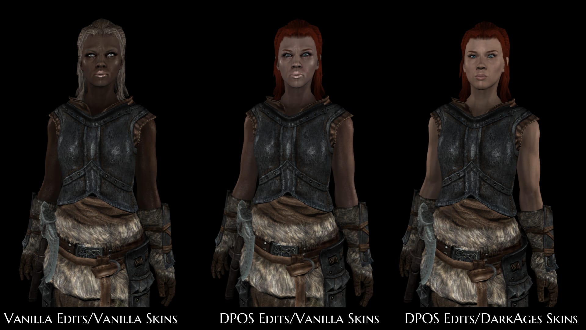 In the galleries below there are showcases of what DPOS does with or without skins. The vanilla skins are very opaque and so dirty it’s hard to get a grasp on your actual options. Dark Ages Skins was chosen to display the range of options due to the fact it offers zero pixelation and faux smudges so you can get a visual idea of how your character can look. As always: DPOS contains no skin textures itself.