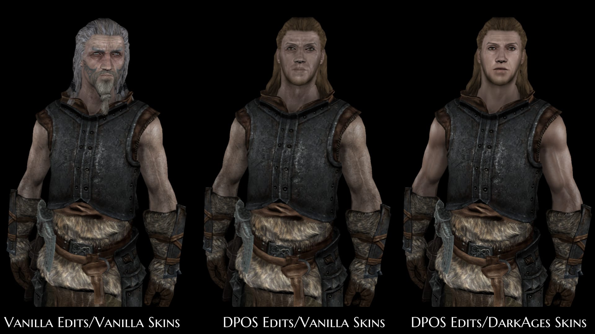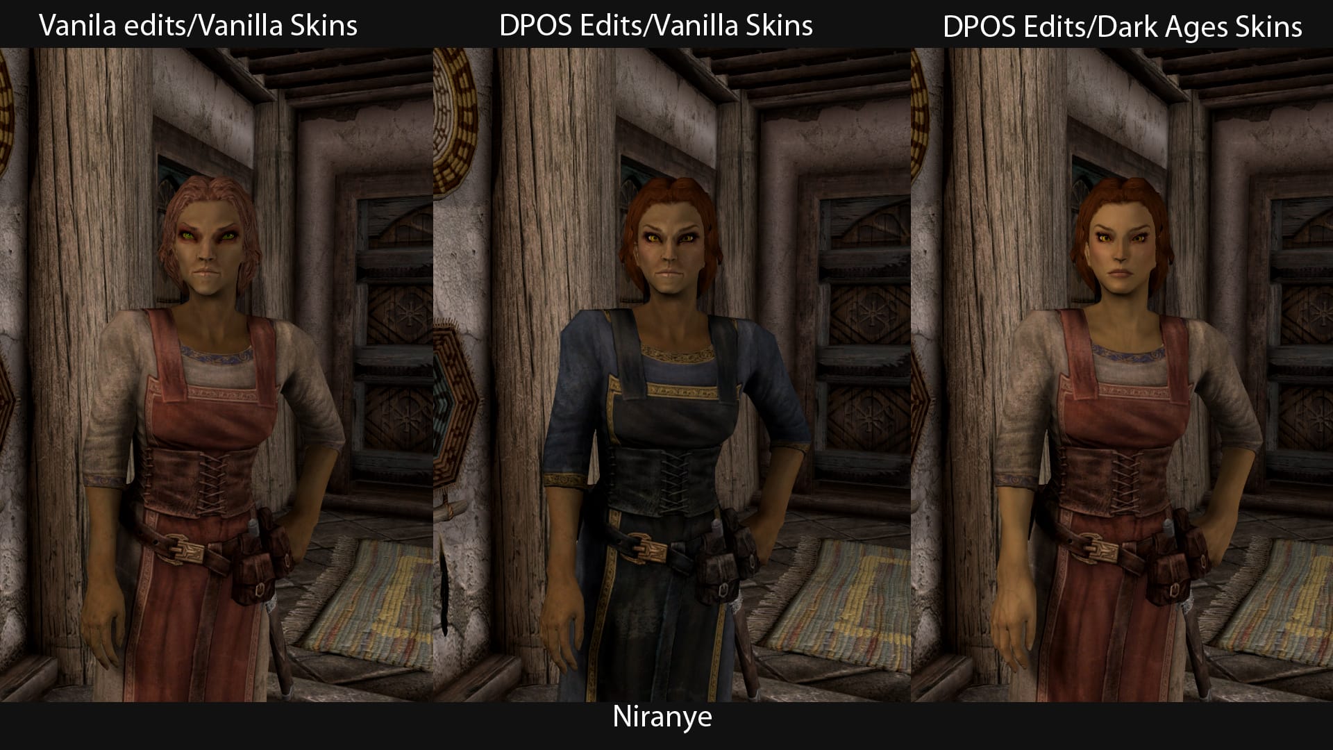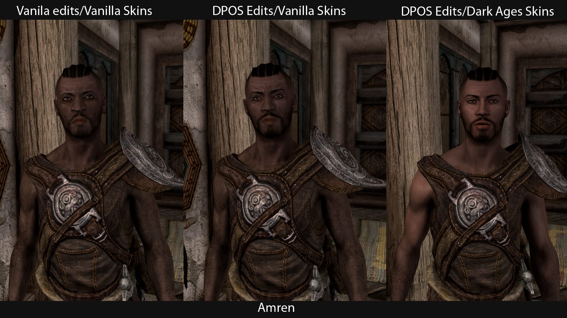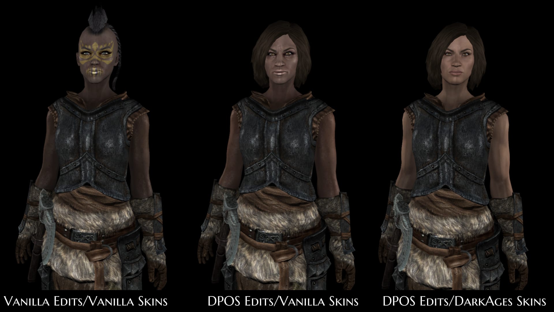 In the galleries below there are showcases of what DPOS does with or without skins. The vanilla skins are very opaque and so dirty it’s hard to get a grasp on your actual options. Dark Ages Skins was chosen to display the range of options due to the fact it offers zero pixelation and faux smudges so you can get a visual idea of how your character can look. As always: DPOS contains no skin textures itself.
