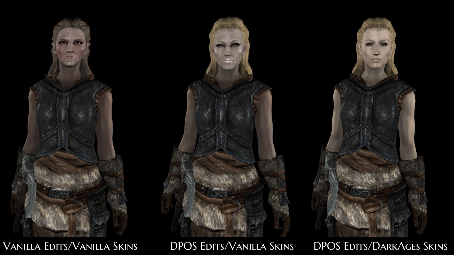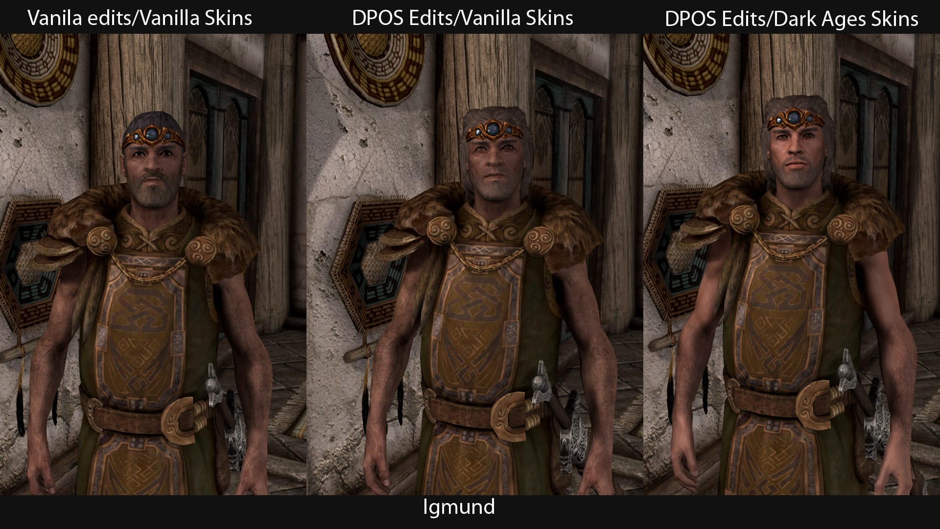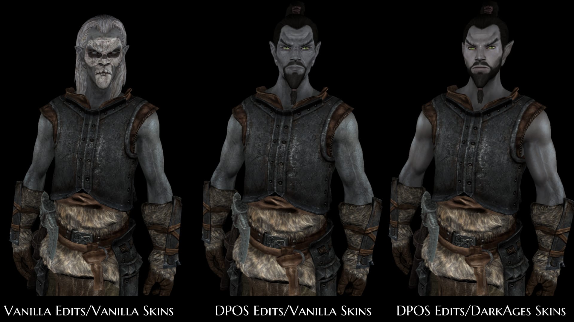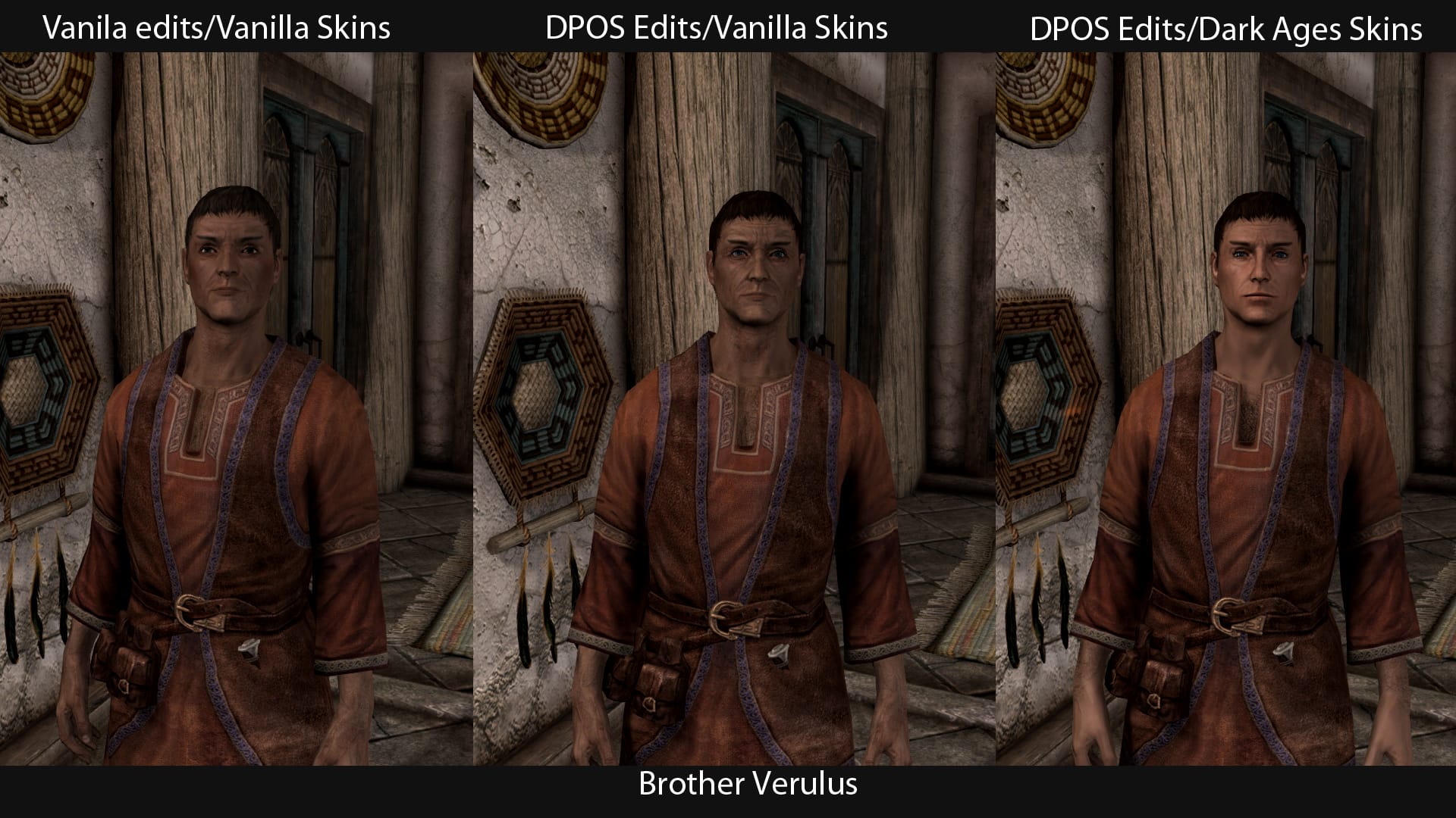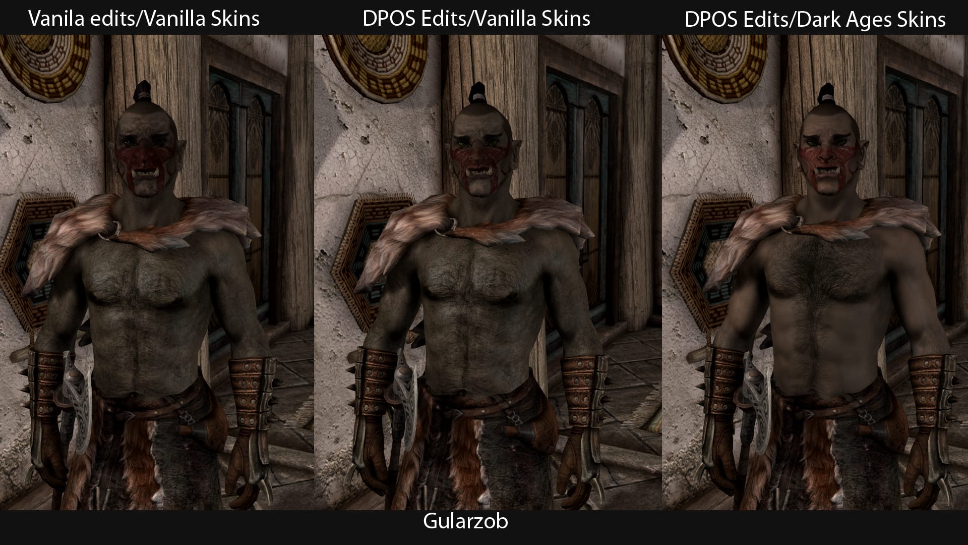 In the galleries below there are showcases of what DPOS does with or without skins. The vanilla skins are very opaque and so dirty it’s hard to get a grasp on your actual options. Dark Ages Skins was chosen to display the range of options due to the fact it offers zero pixelation and faux smudges so you can get a visual idea of how your character can look. As always: DPOS contains no skin textures itself.
