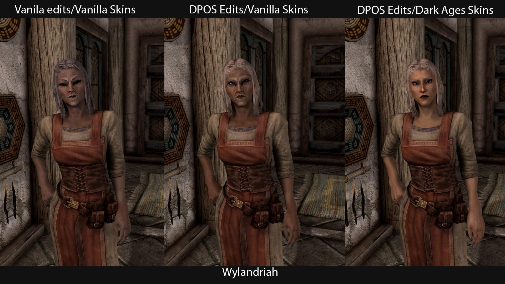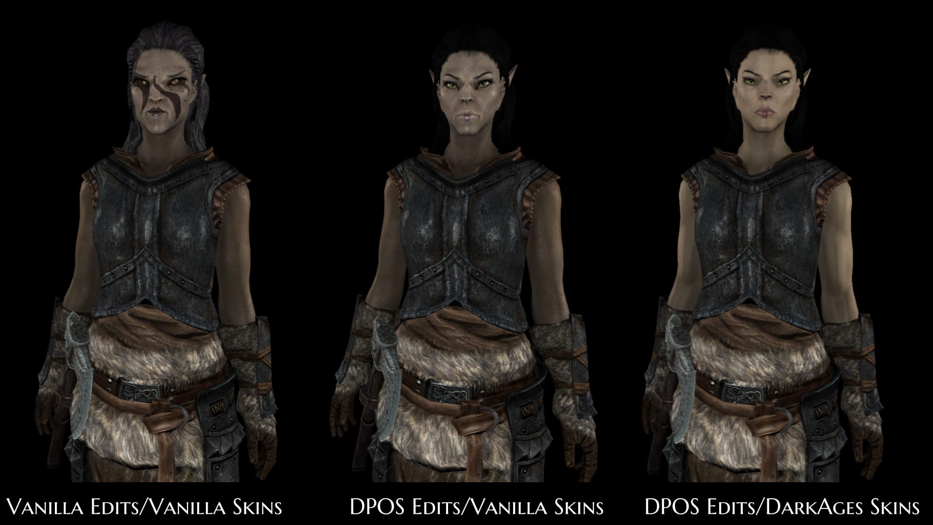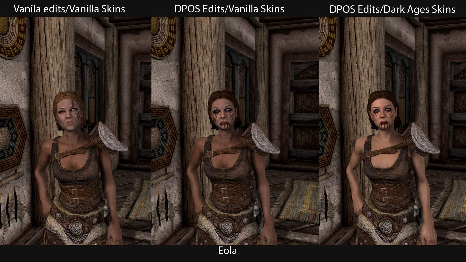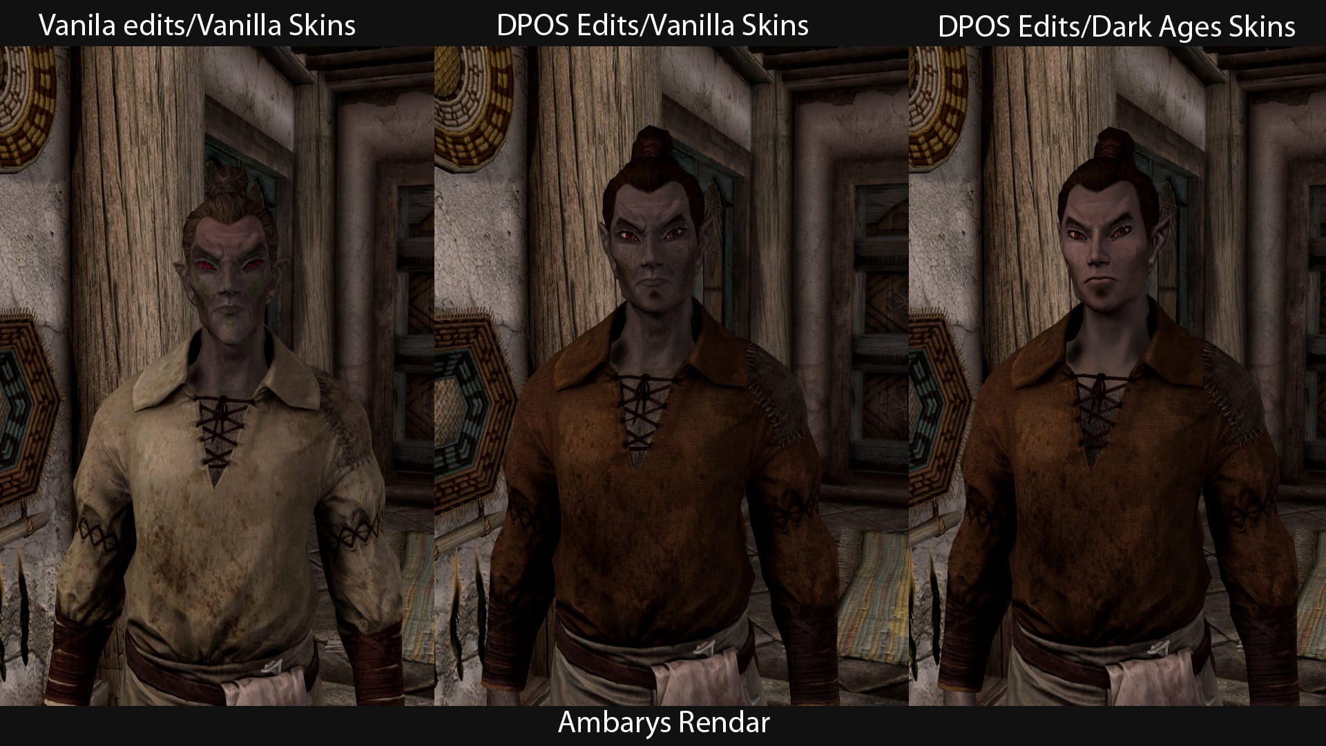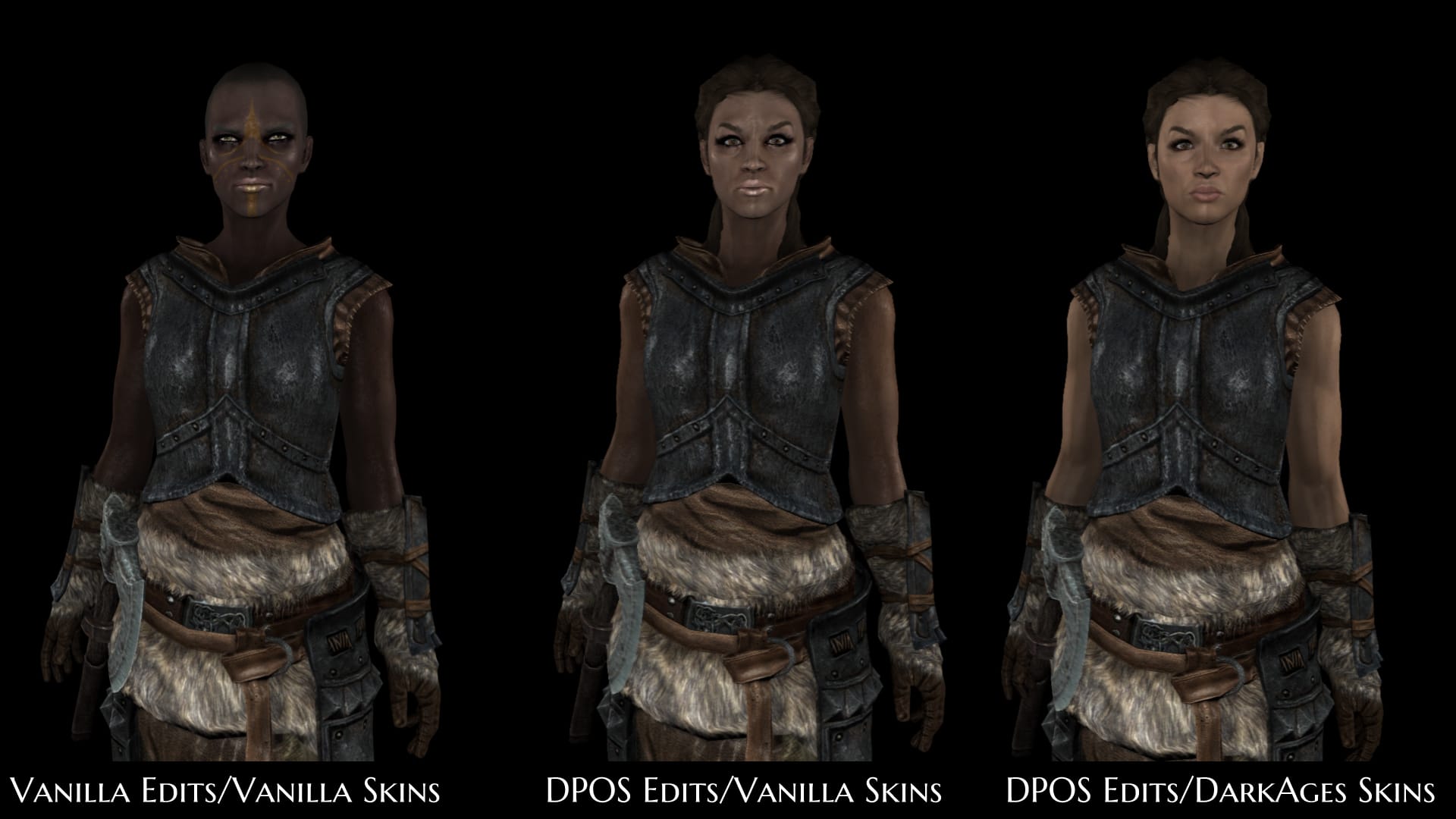 In the galleries below there are showcases of what DPOS does with or without skins. The vanilla skins are very opaque and so dirty it’s hard to get a grasp on your actual options. Dark Ages Skins was chosen to display the range of options due to the fact it offers zero pixelation and faux smudges so you can get a visual idea of how your character can look. As always: DPOS contains no skin textures itself.