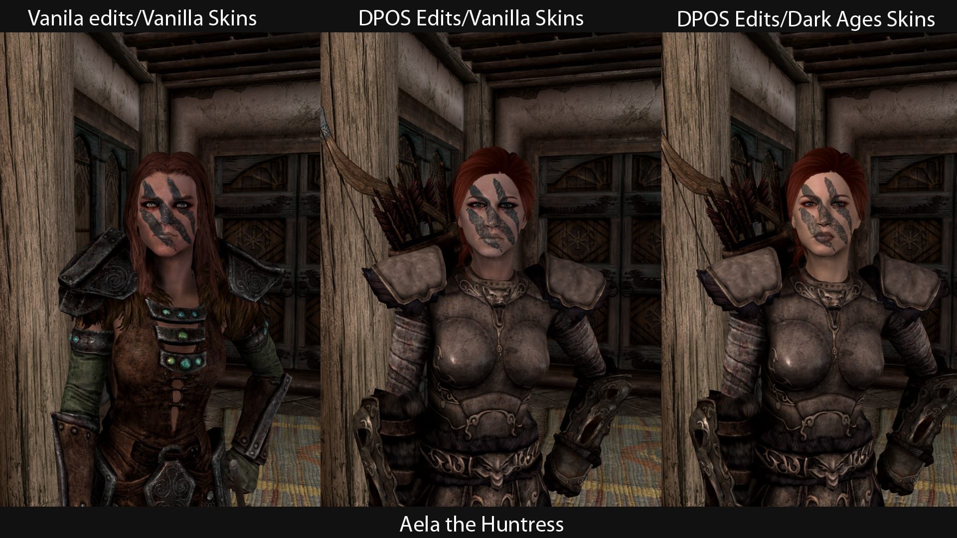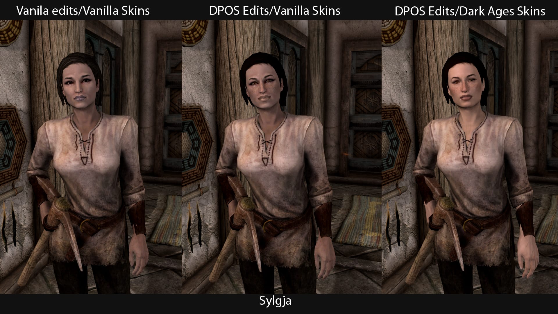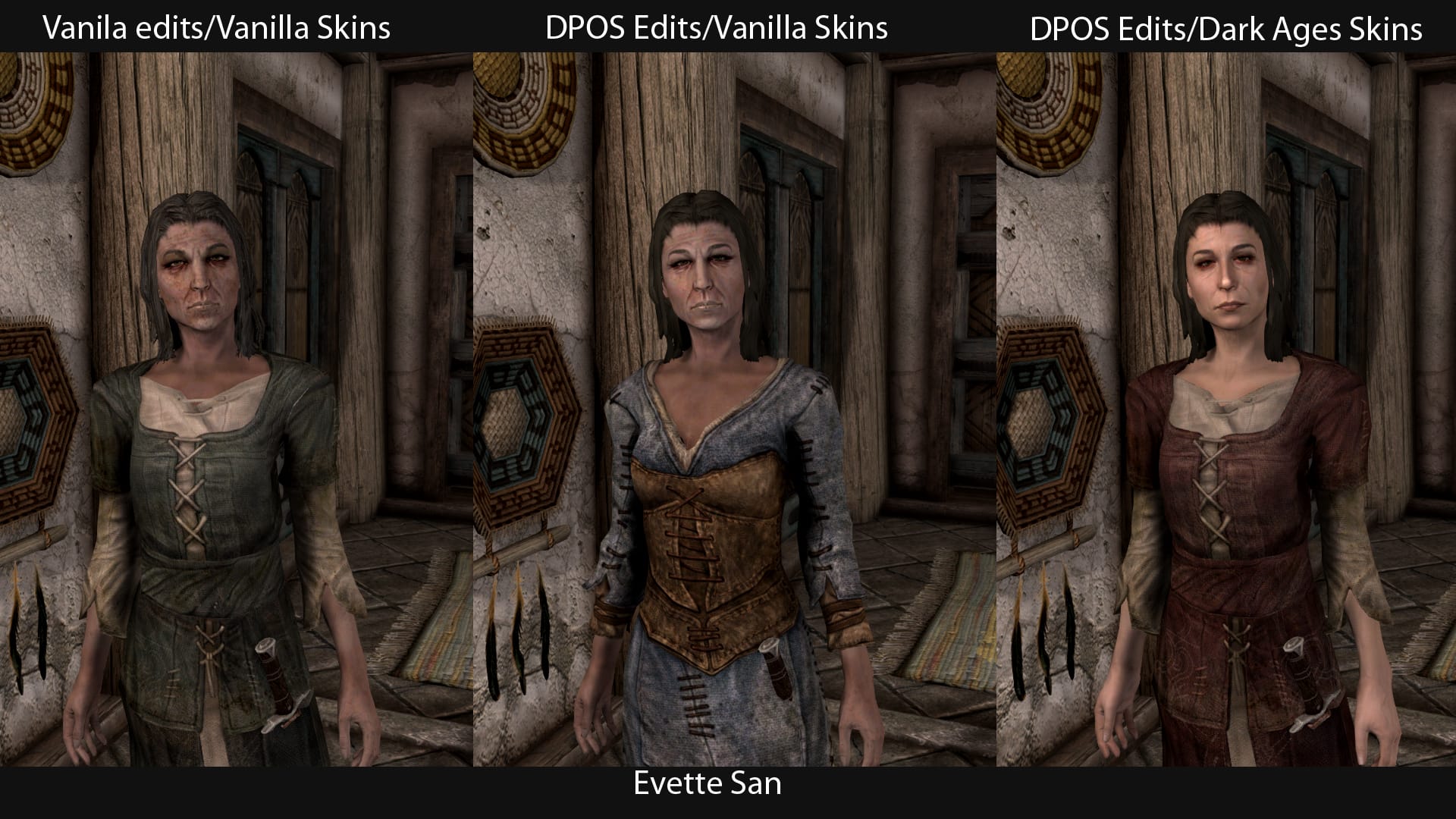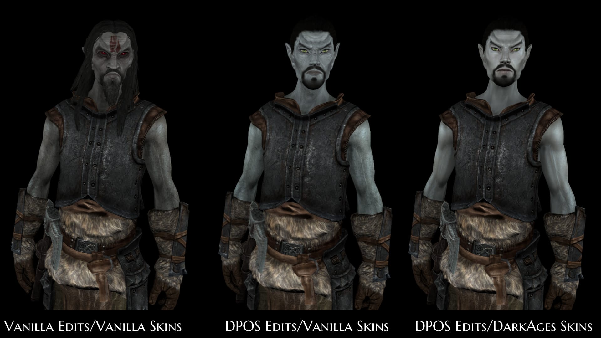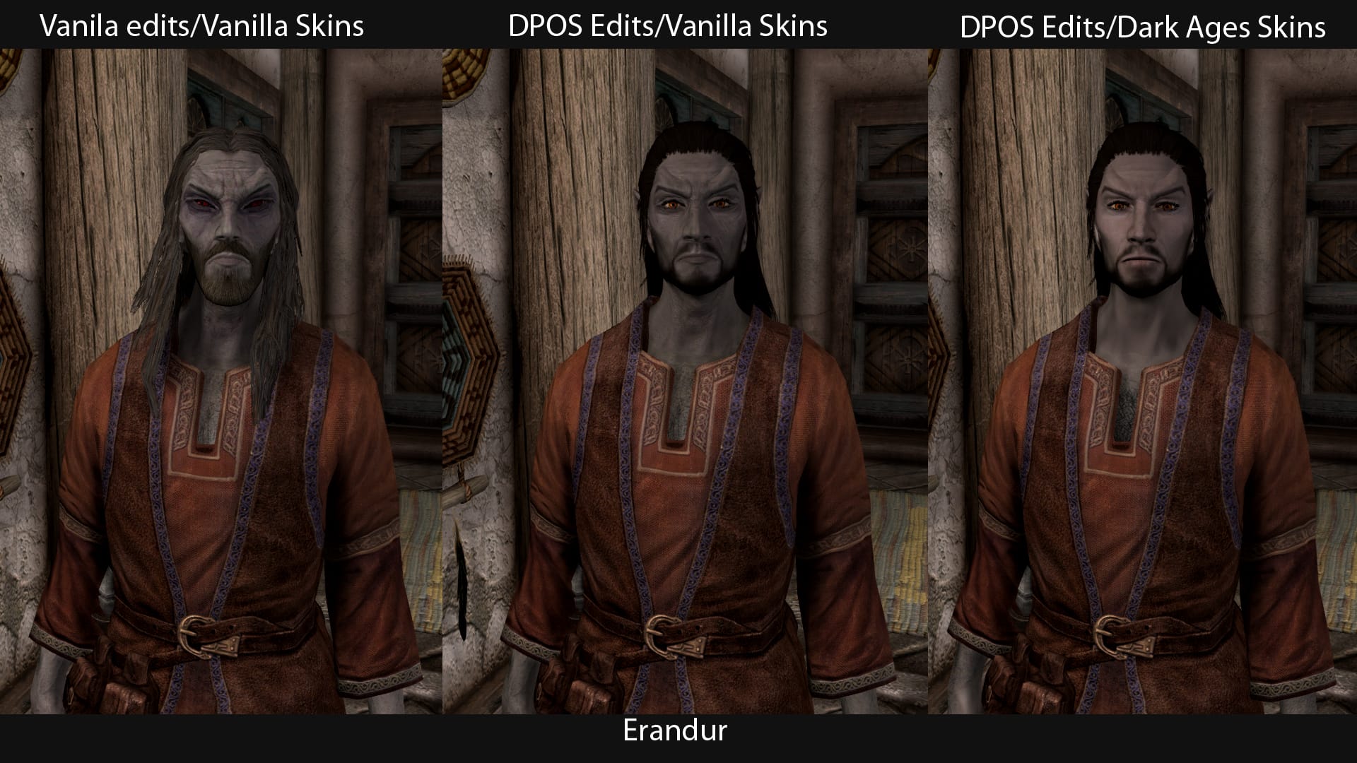 In the galleries below there are showcases of what DPOS does with or without skins. The vanilla skins are very opaque and so dirty it’s hard to get a grasp on your actual options. Dark Ages Skins was chosen to display the range of options due to the fact it offers zero pixelation and faux smudges so you can get a visual idea of how your character can look. As always: DPOS contains no skin textures itself.