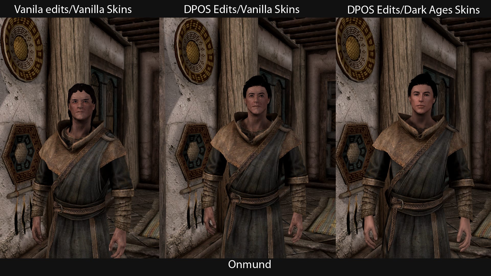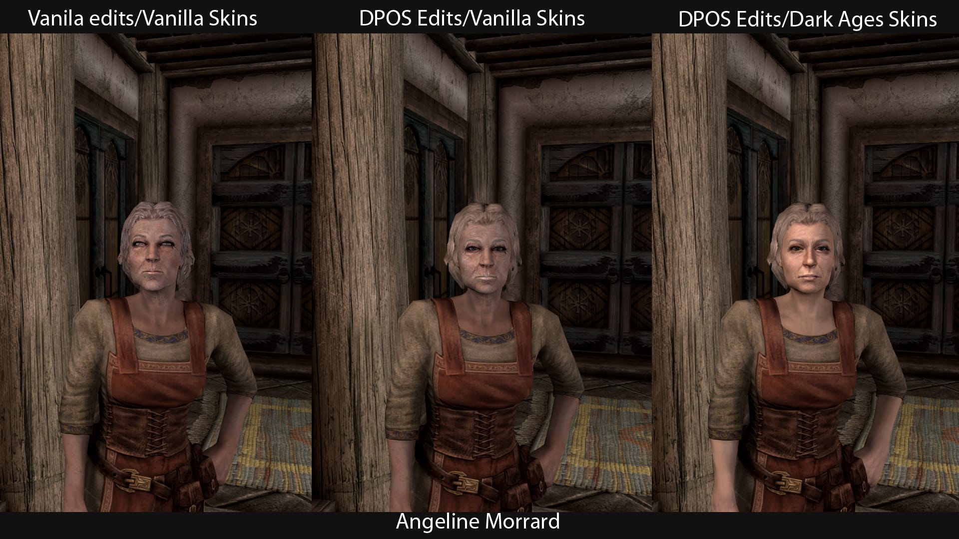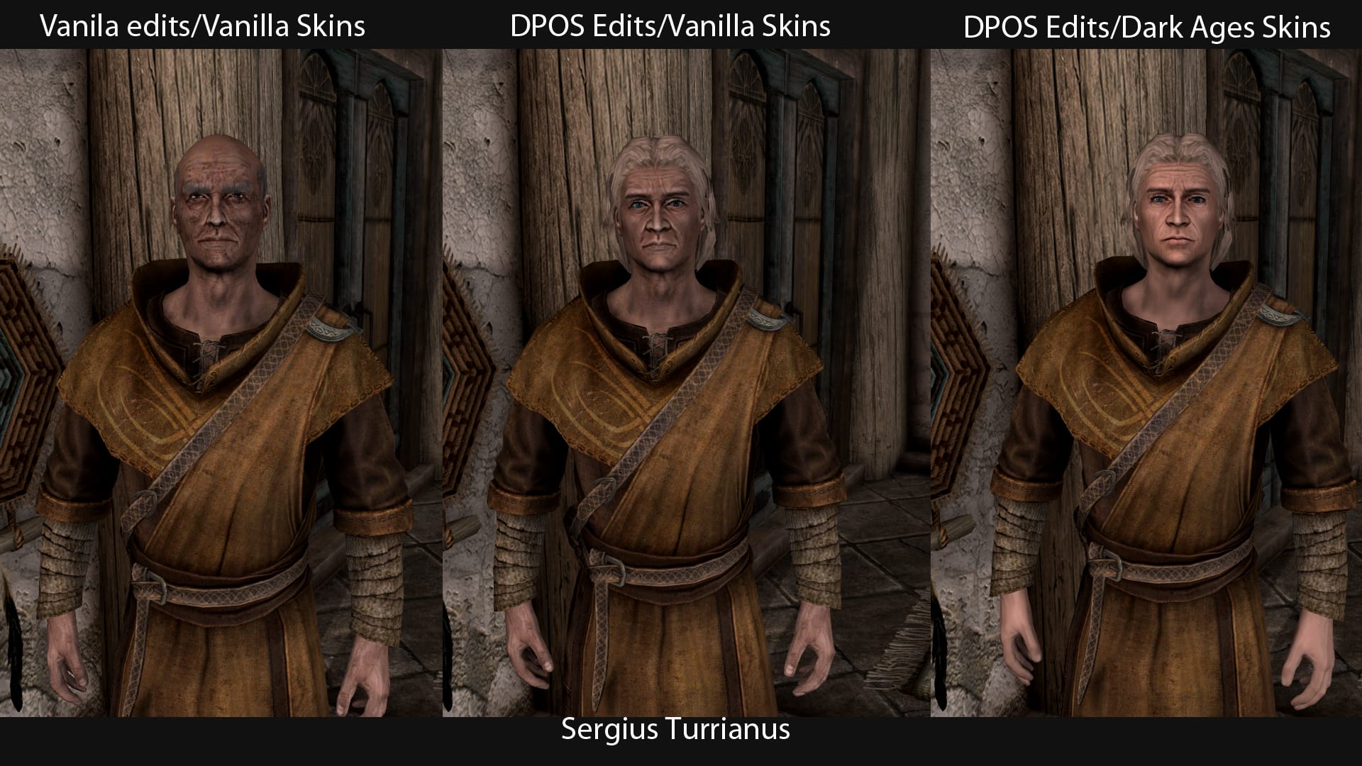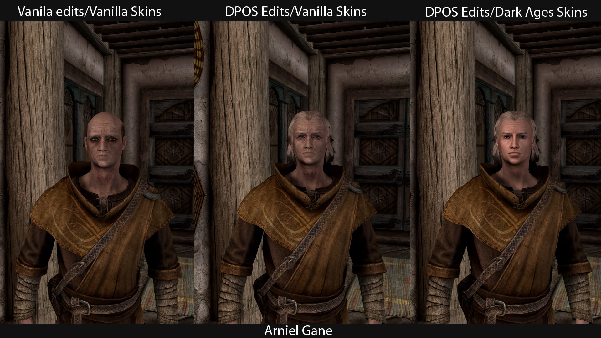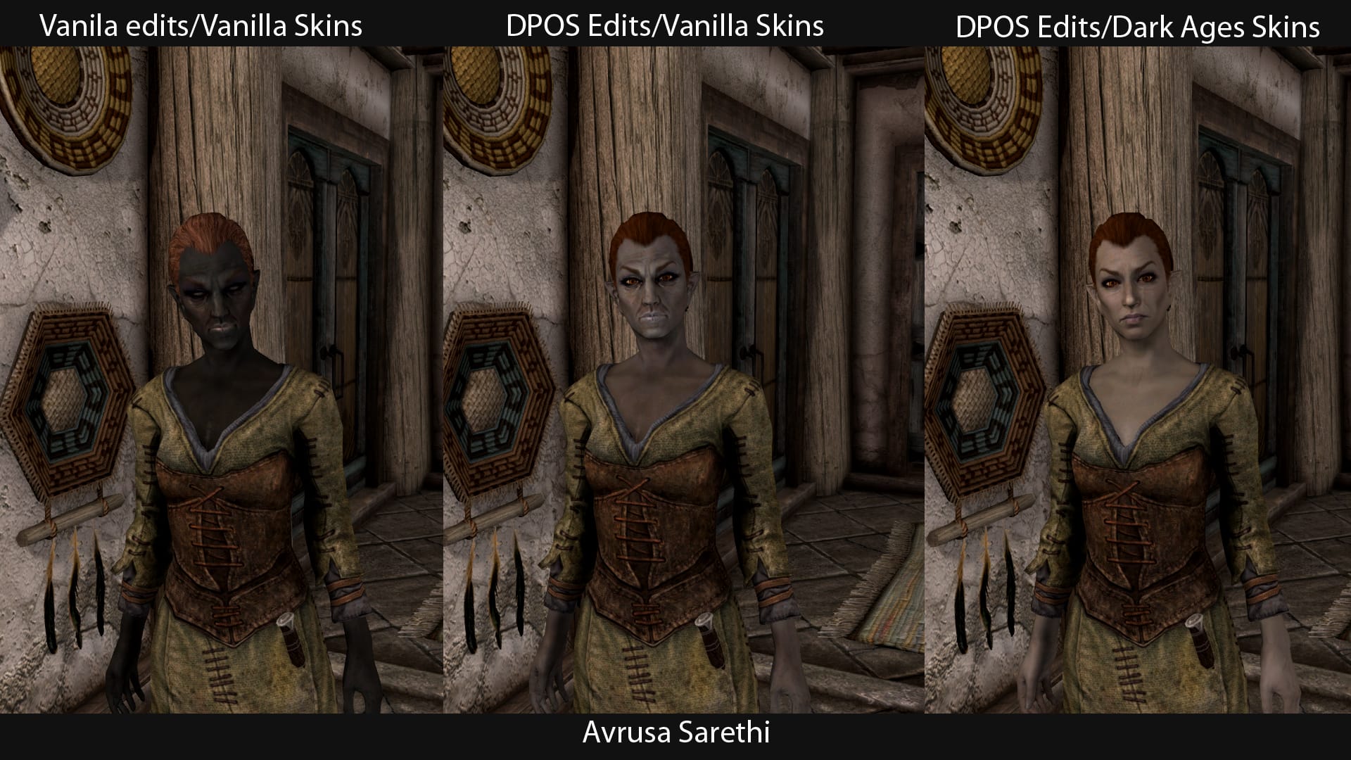 In the galleries below there are showcases of what DPOS does with or without skins. The vanilla skins are very opaque and so dirty it’s hard to get a grasp on your actual options. Dark Ages Skins was chosen to display the range of options due to the fact it offers zero pixelation and faux smudges so you can get a visual idea of how your character can look. As always: DPOS contains no skin textures itself.