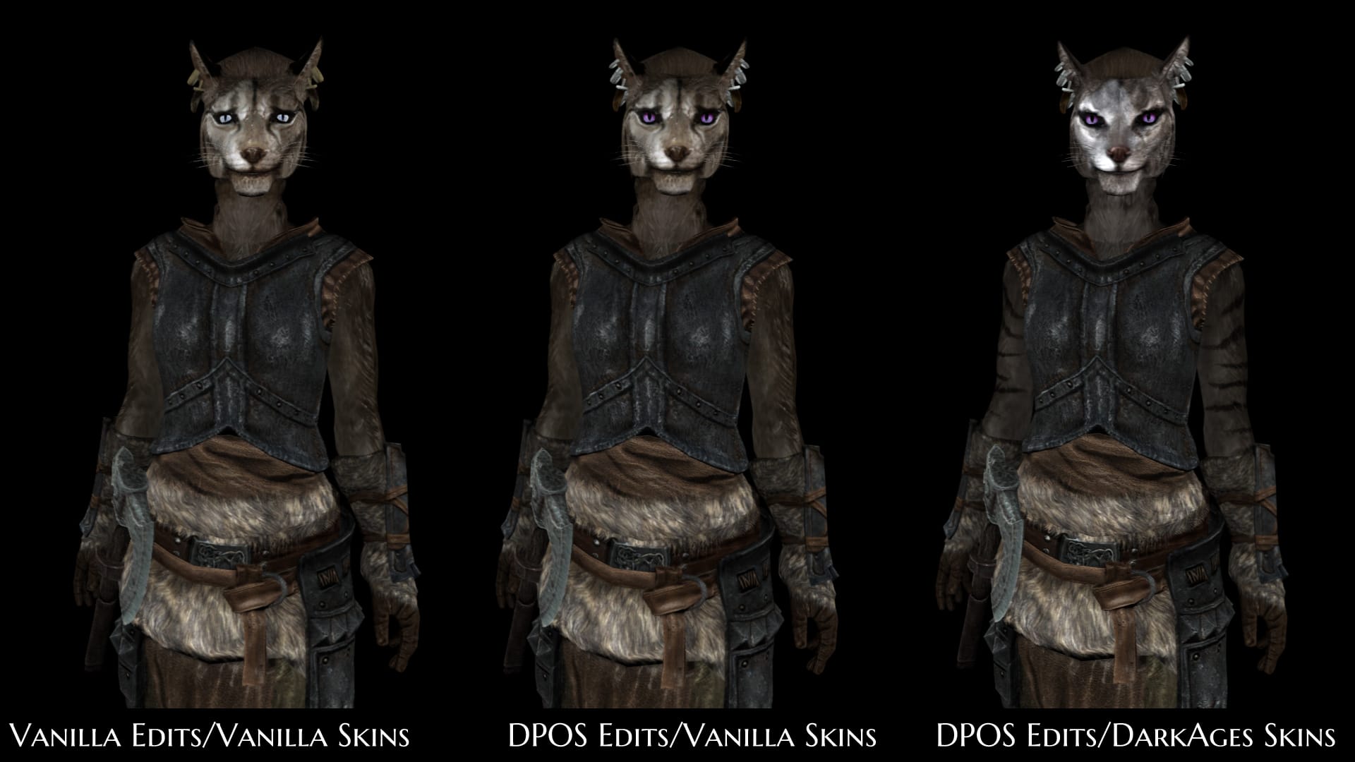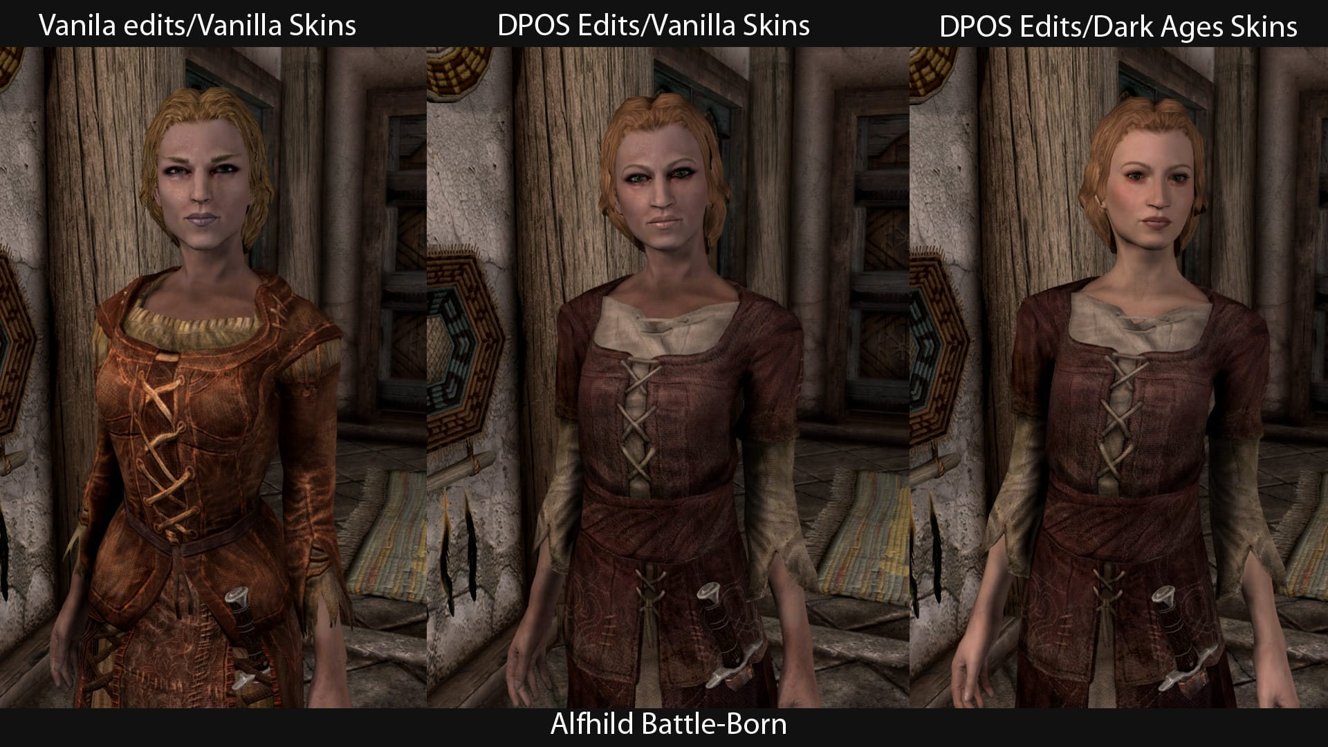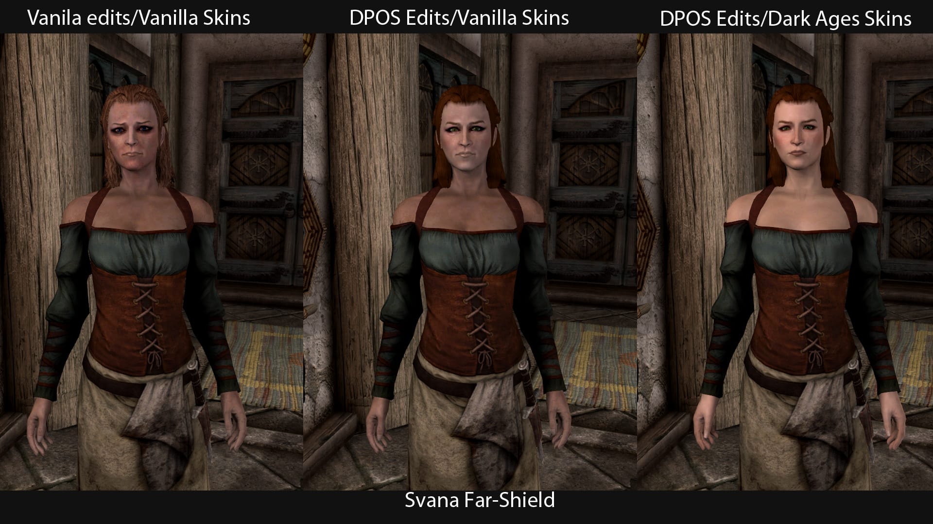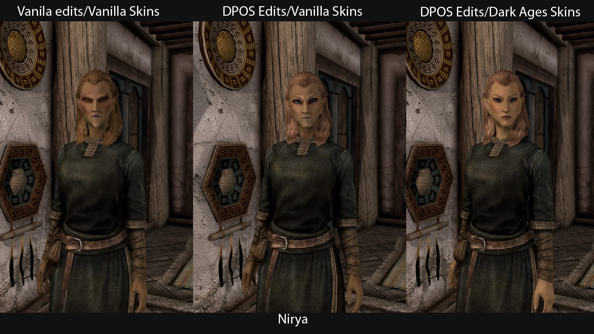 In the galleries below there are showcases of what DPOS does with or without skins. The vanilla skins are very opaque and so dirty it’s hard to get a grasp on your actual options. Dark Ages Skins was chosen to display the range of options due to the fact it offers zero pixelation and faux smudges so you can get a visual idea of how your character can look. As always: DPOS contains no skin textures itself.