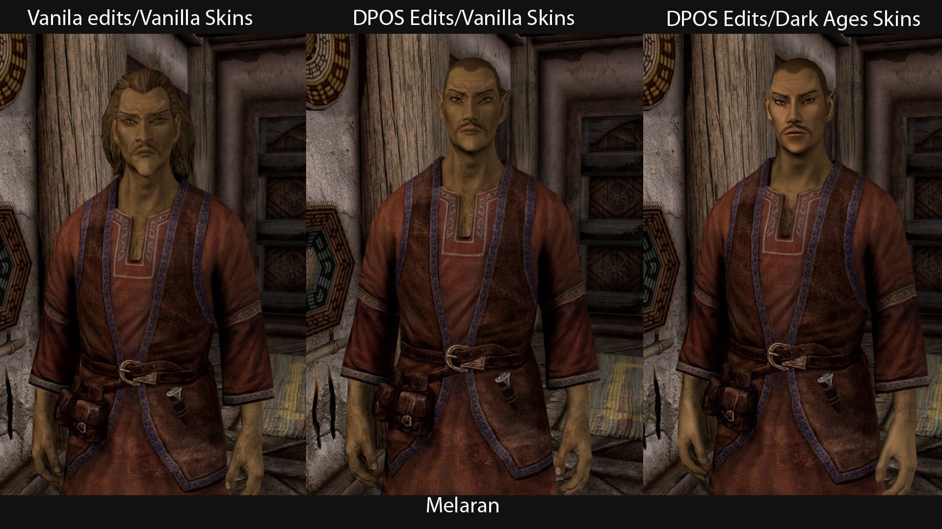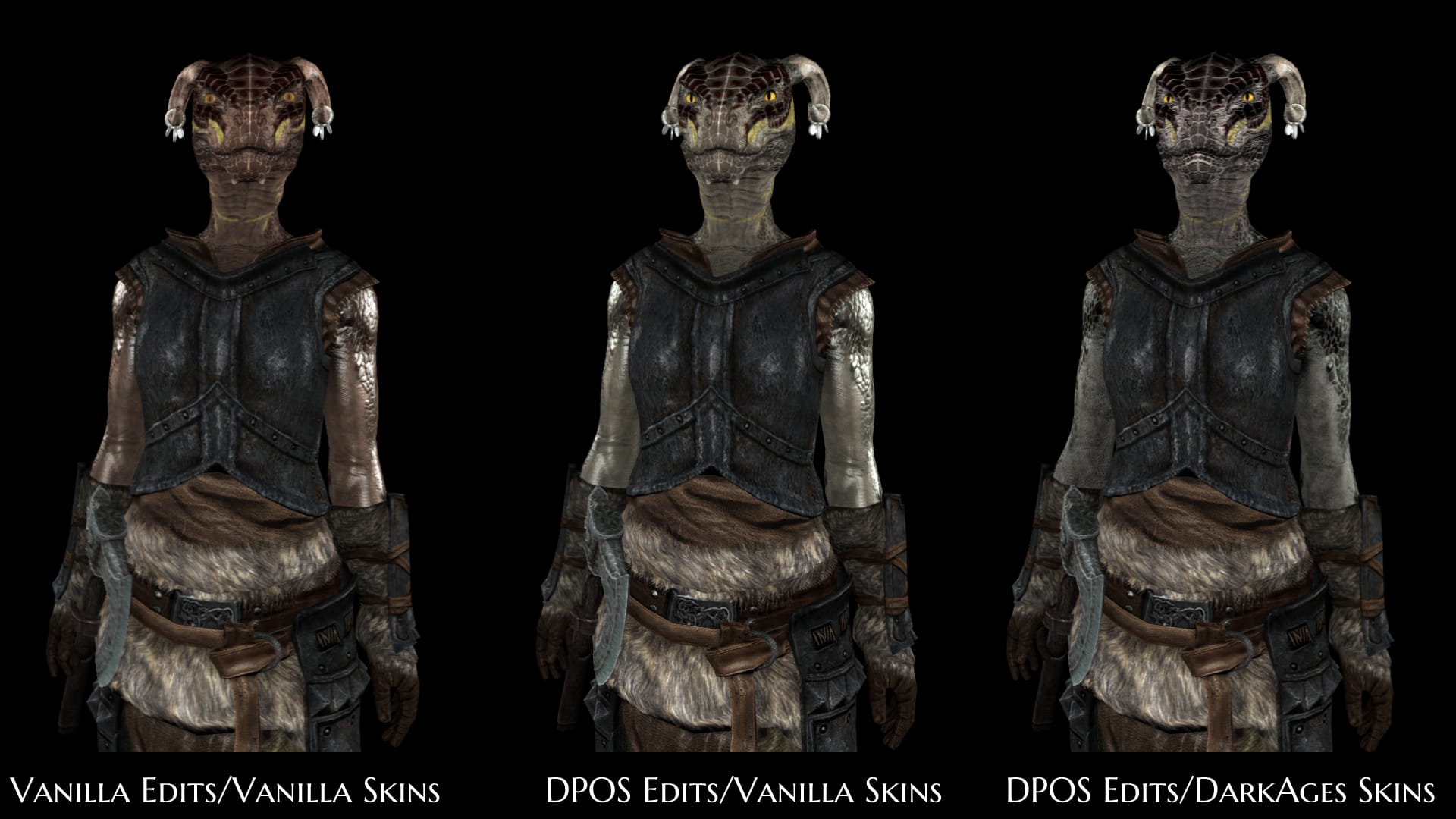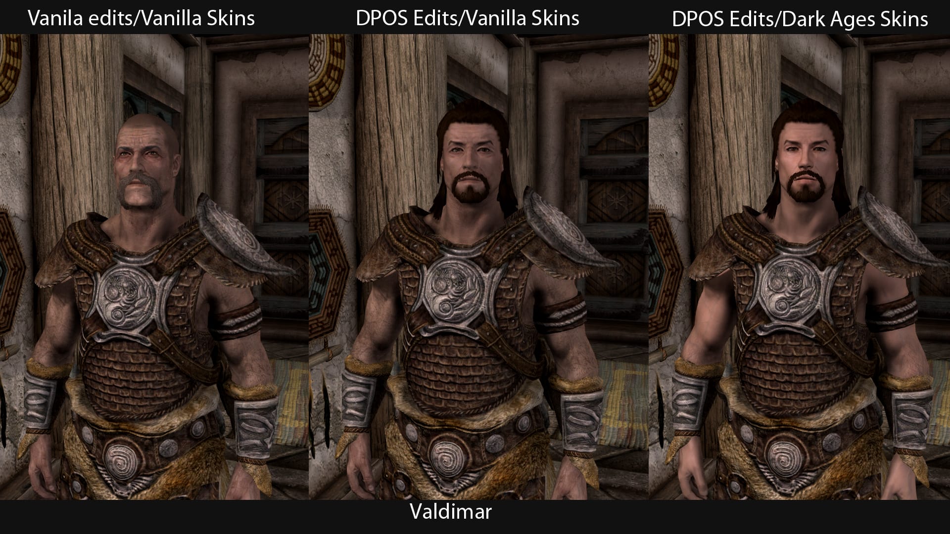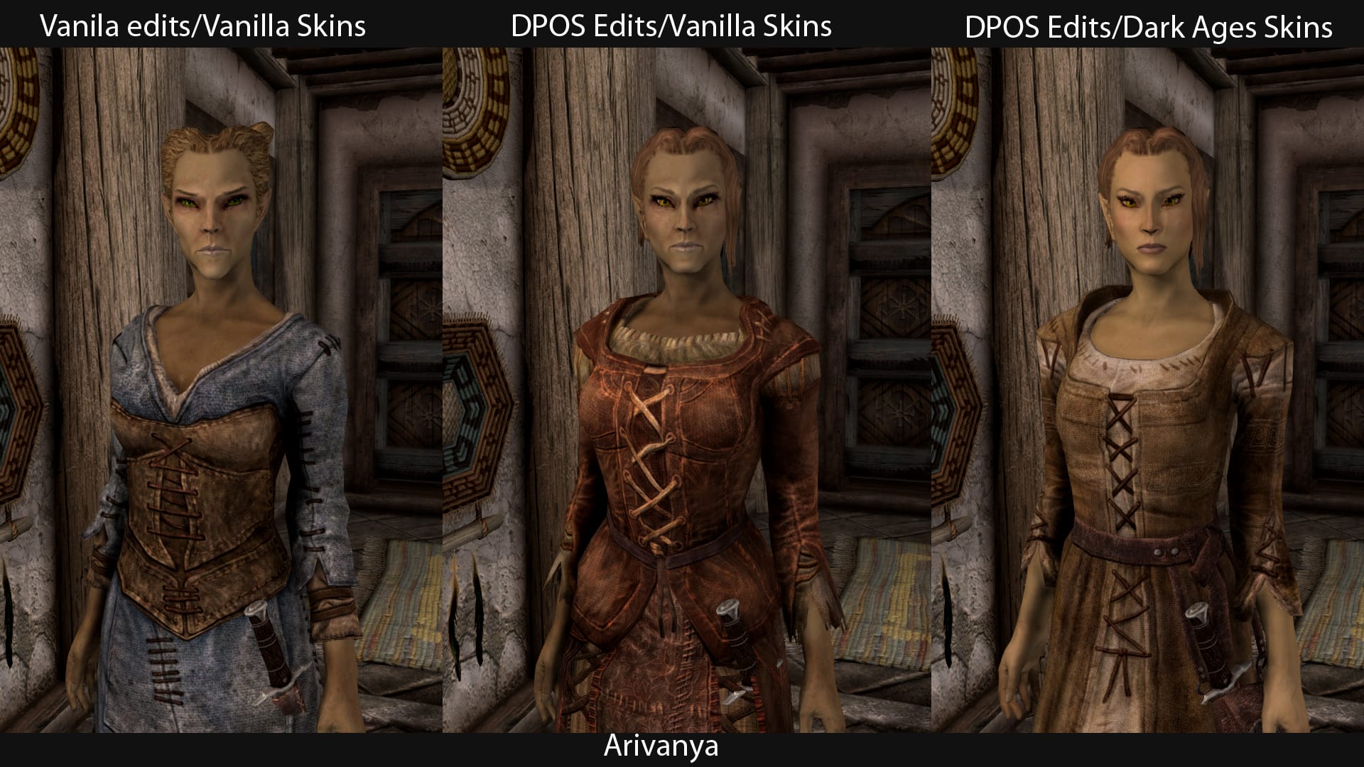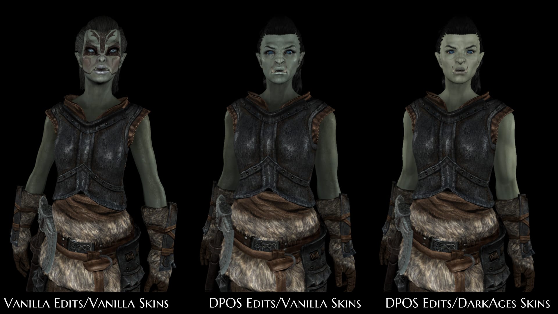 In the galleries below there are showcases of what DPOS does with or without skins. The vanilla skins are very opaque and so dirty it’s hard to get a grasp on your actual options. Dark Ages Skins was chosen to display the range of options due to the fact it offers zero pixelation and faux smudges so you can get a visual idea of how your character can look. As always: DPOS contains no skin textures itself.